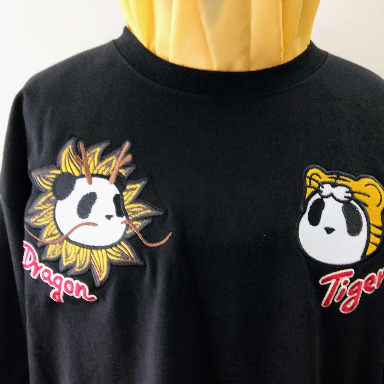 背面には、可愛いパンダが日本列島を挟んで龍とトラの着ぐるみを着た刺繍が施されており、見る人に笑顔を届けます。