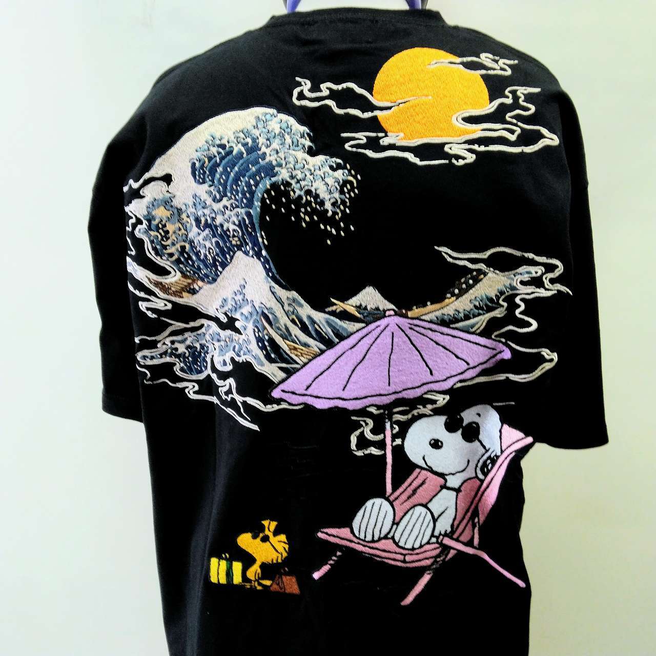 SNOOPY 北斎風大波刺繍 半袖T 黒 XXL