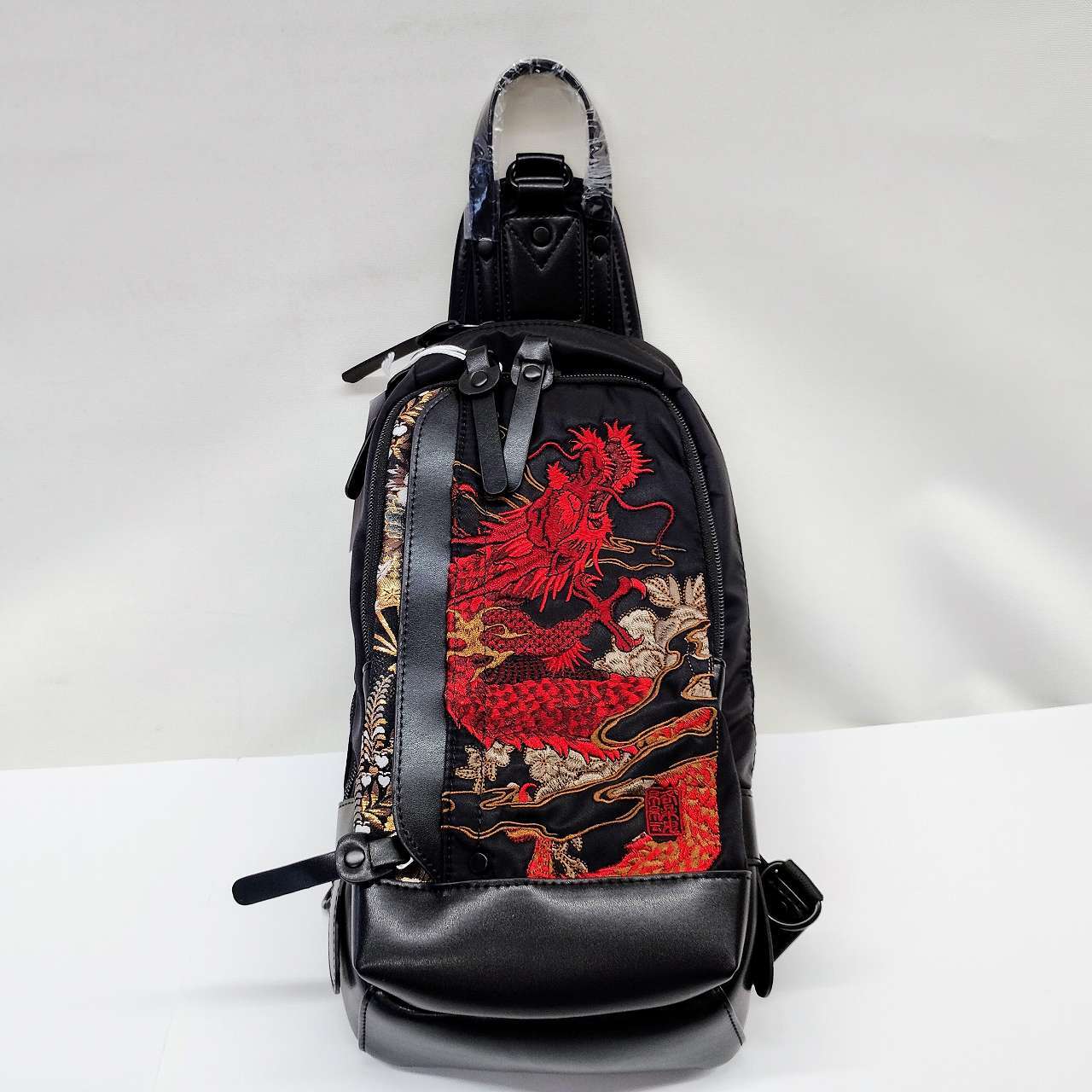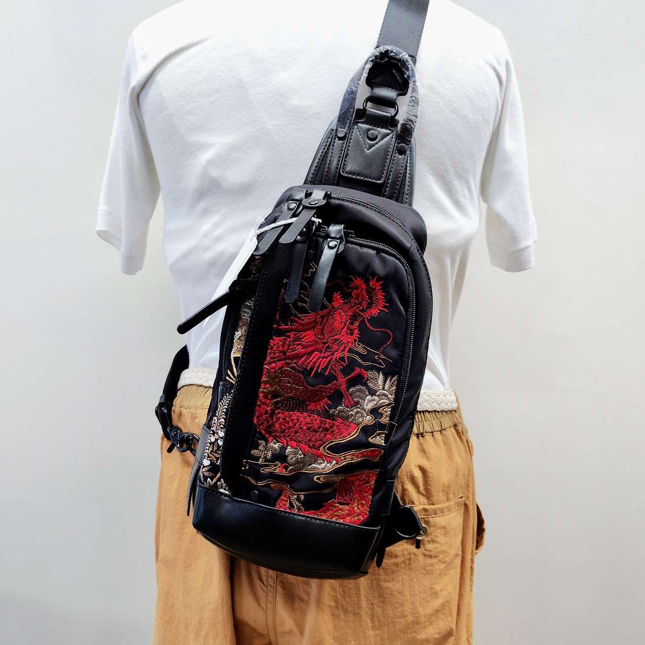 このボディバッグは、力強い龍の刺繍が施された特別なデザインで、シンプルながらも存在感のある一品です。