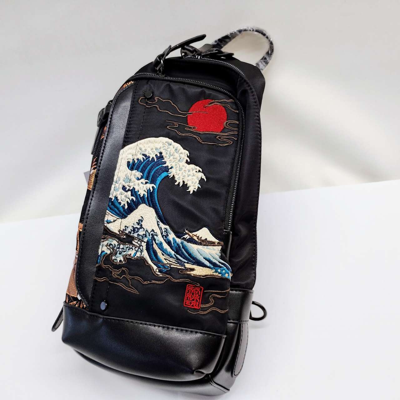 このボディバッグは、名画『神奈川沖浪裏』の刺繍が施された特別なデザインが特徴です。