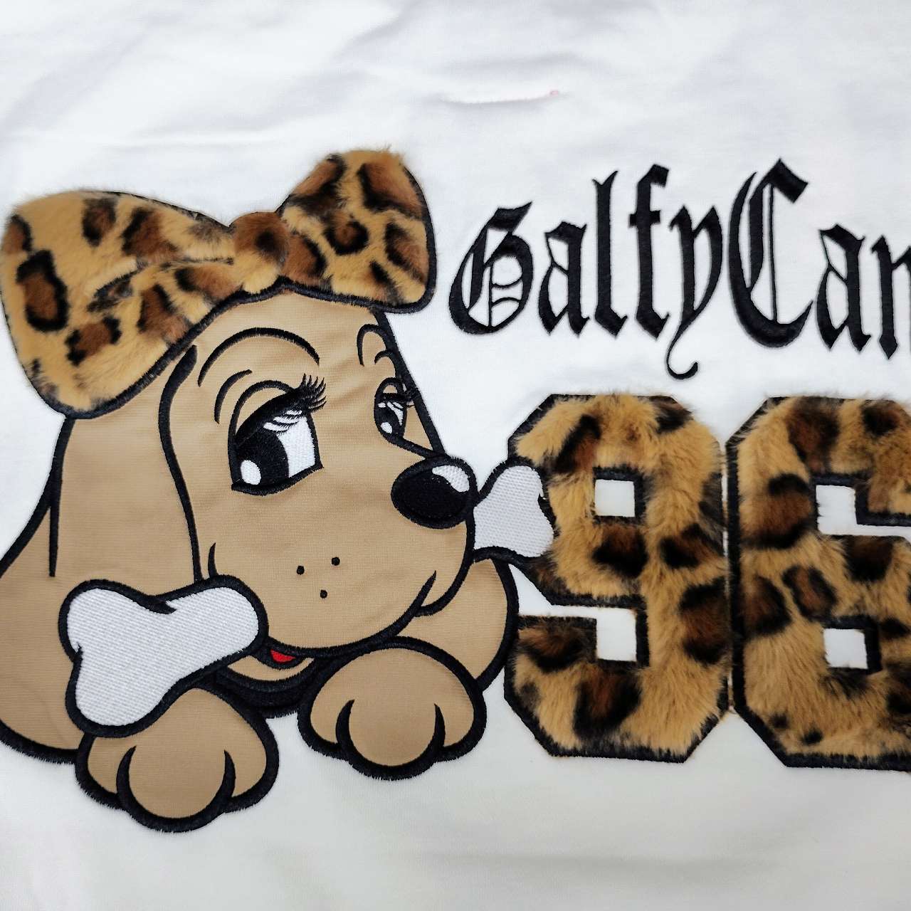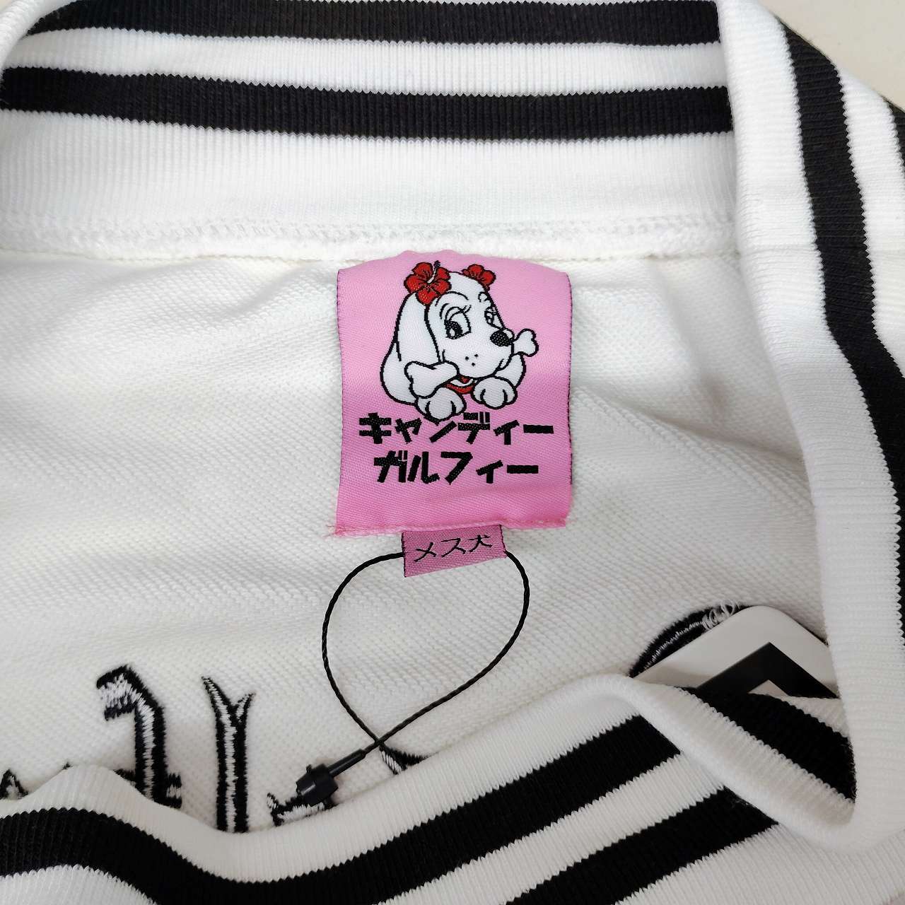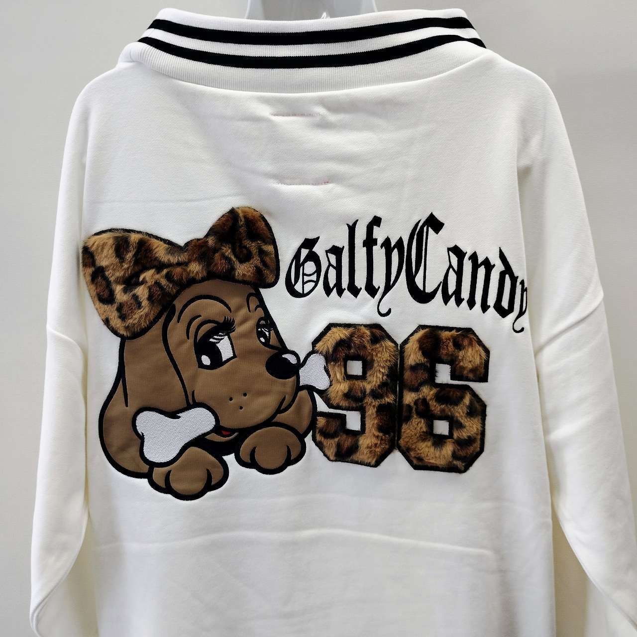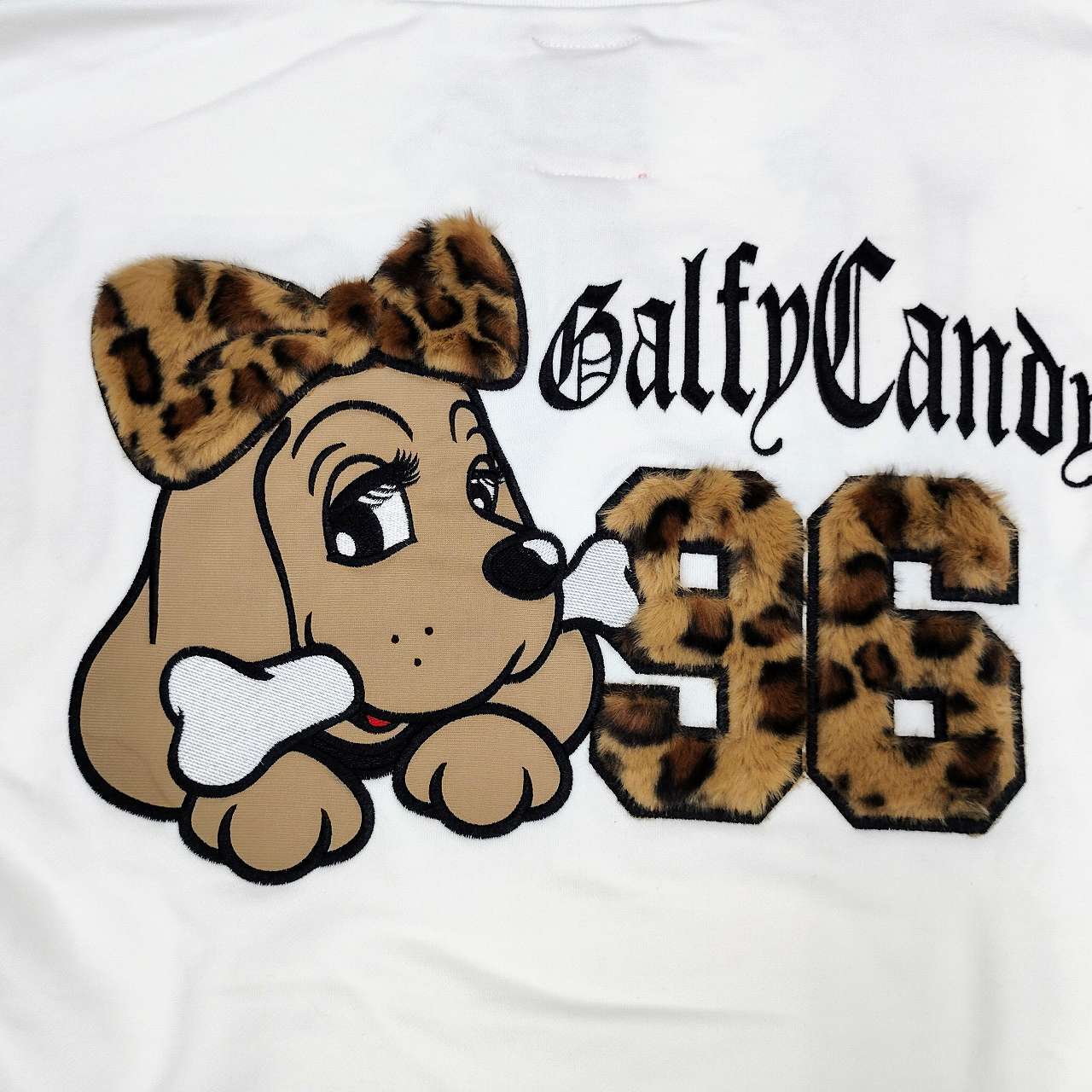 オフショルダーのデザインが魅力的で、シンプルな白地にはCANDYGALFYのダイナミックな文字刺繍が施されています。