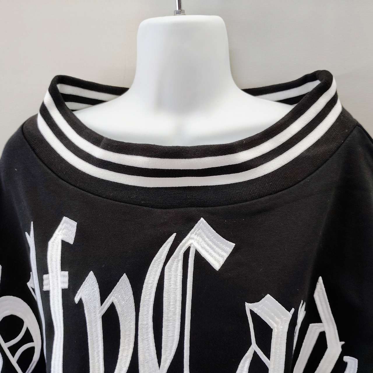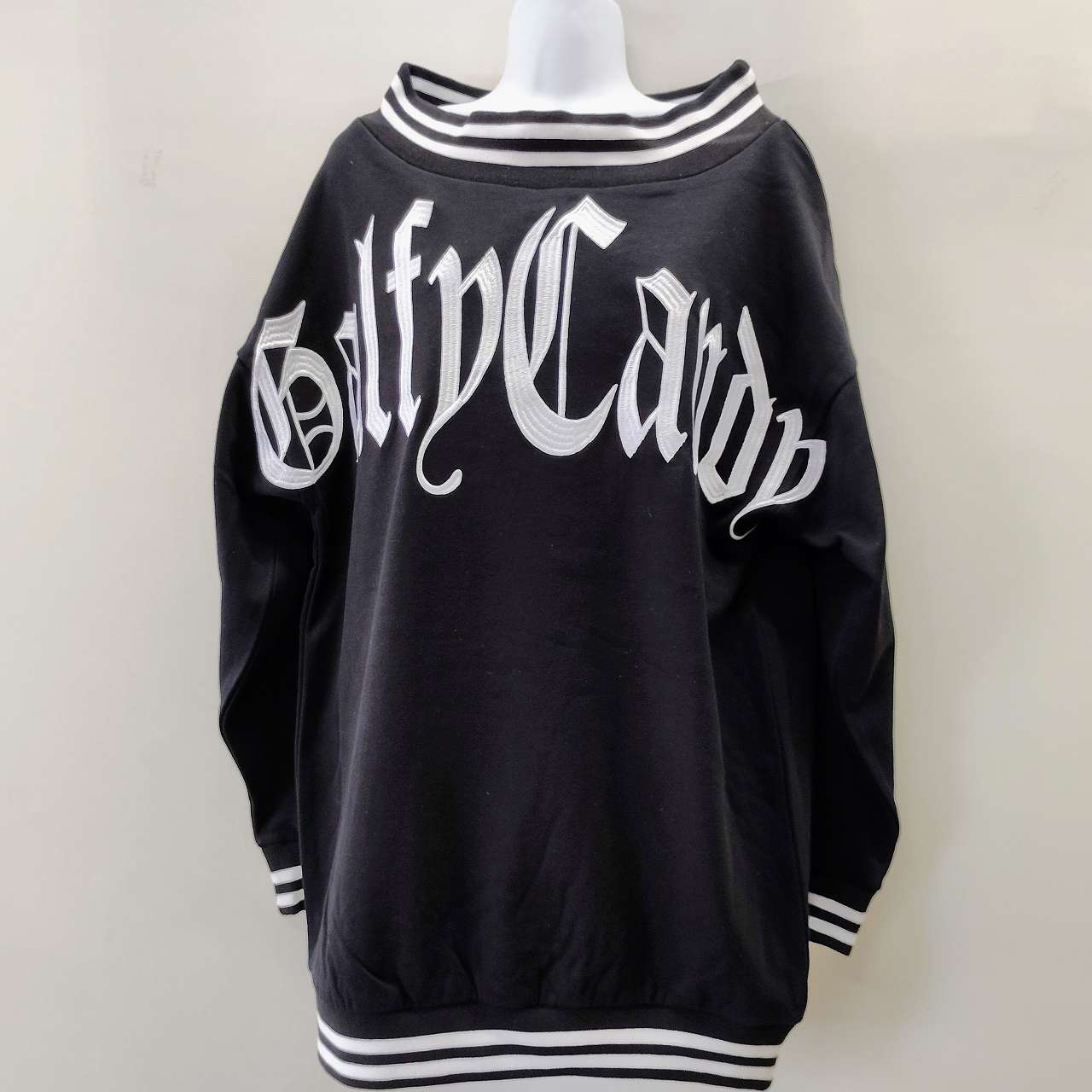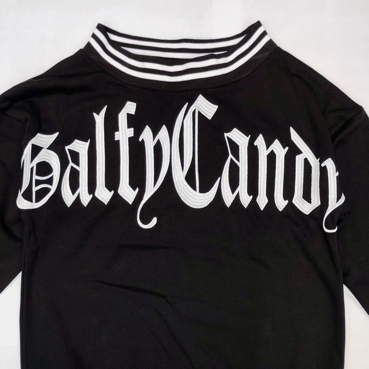 オフショルダーのデザインが魅力的で、シンプルな黒地にはCANDYGALFYのダイナミックな文字刺繍が施されています。