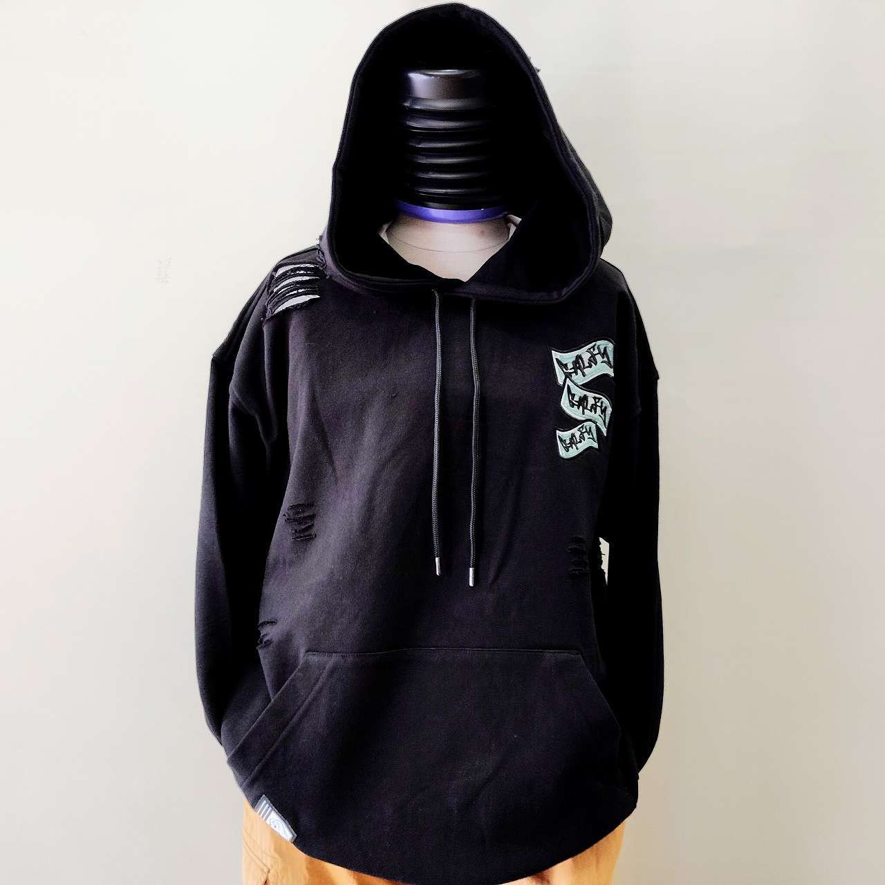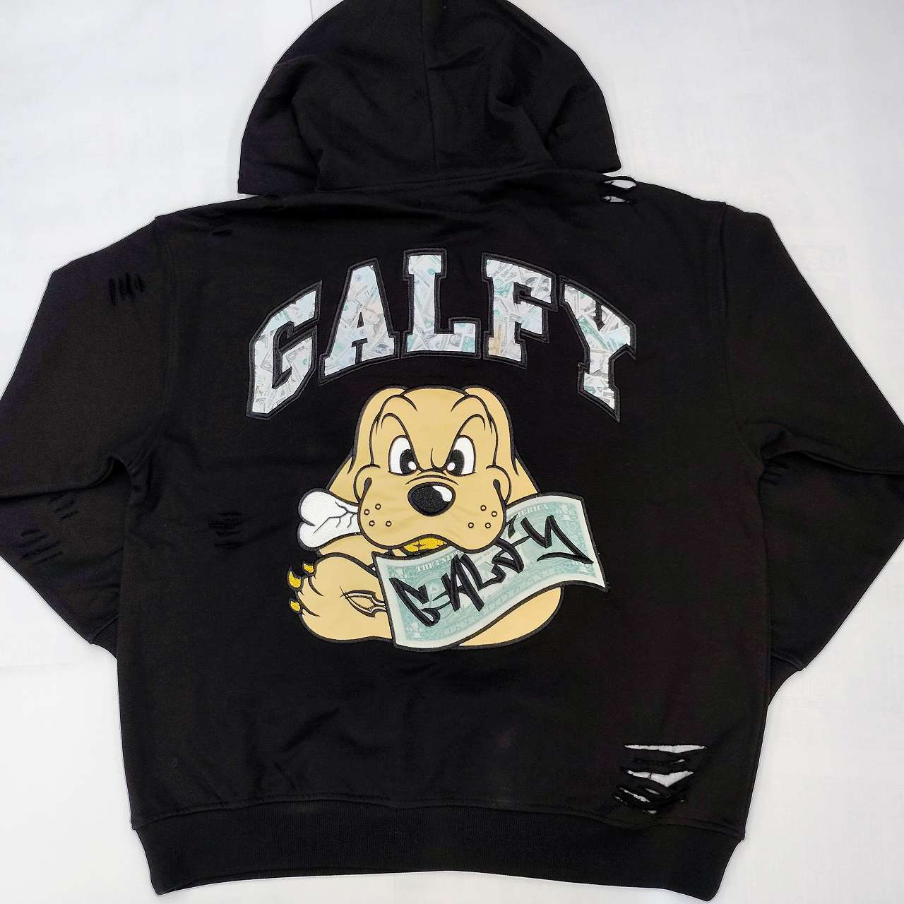 Elevate your style with the "GALFY Okanesuki Damaged Hoodie in Black" — a distinctive addition to your wardrobe!