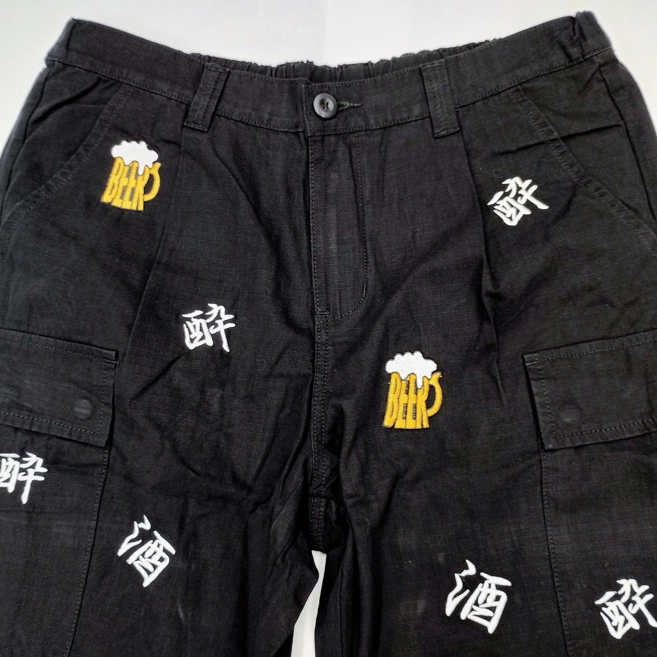 全体に散りばめられた「ビール」「酒」「酔」の文字が、あなたの酒好きアピールをサポートする個性的なデザインのカーゴパンツが登場しました!
