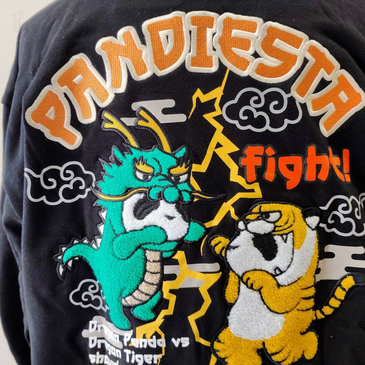 背中にパンダが着ぐるみを着て、龍とトラに変身してバトルを繰り広げるデザインがとても個性的です!
