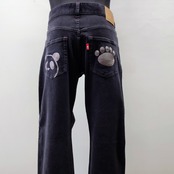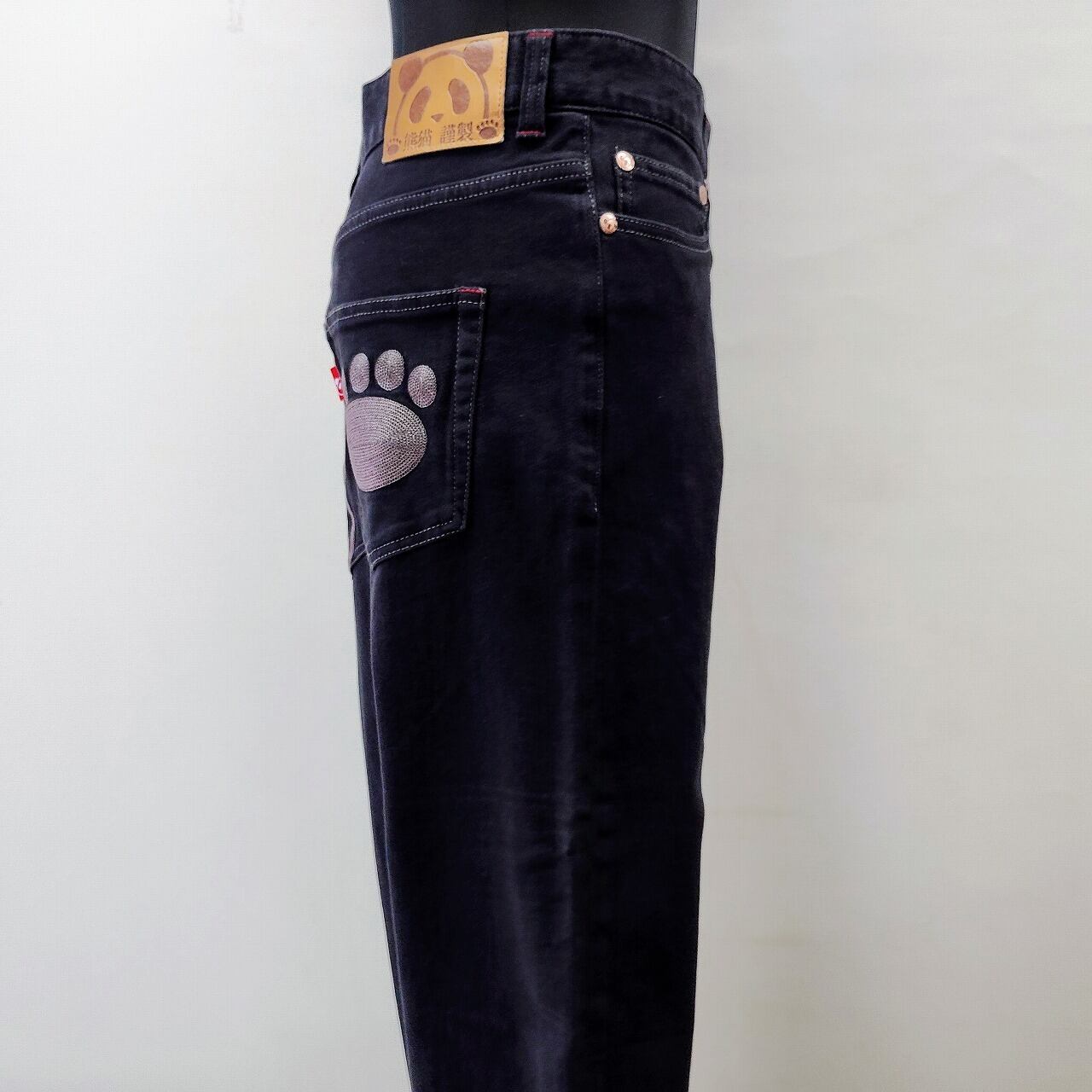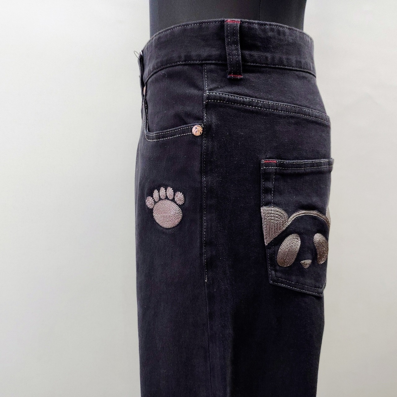 この特別なデニムパンツは、特徴的なお尻のポケットに華やかなパンダとパンダの足跡の刺繍が施されており、カジュアルでありながらもユニークな個性を引き立てる一着です。