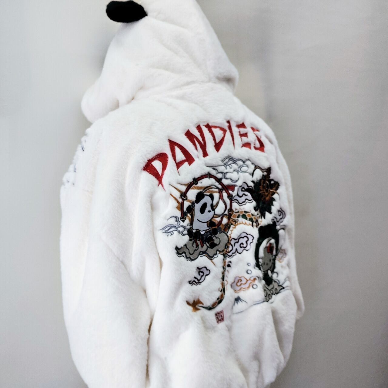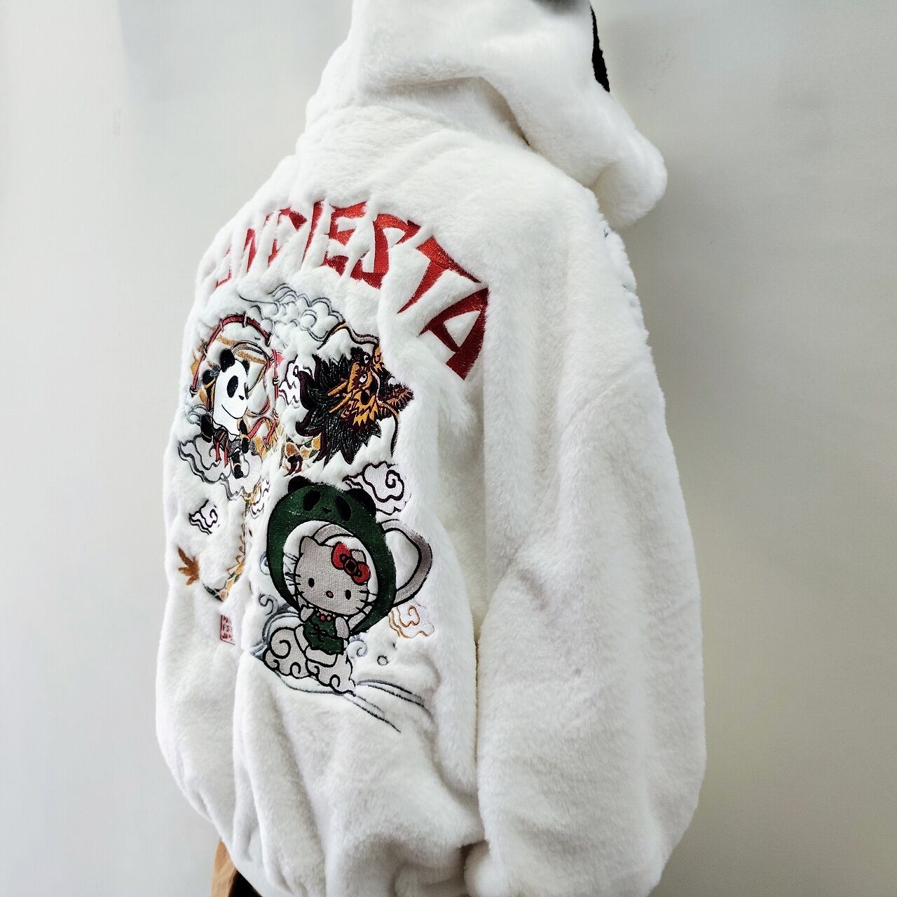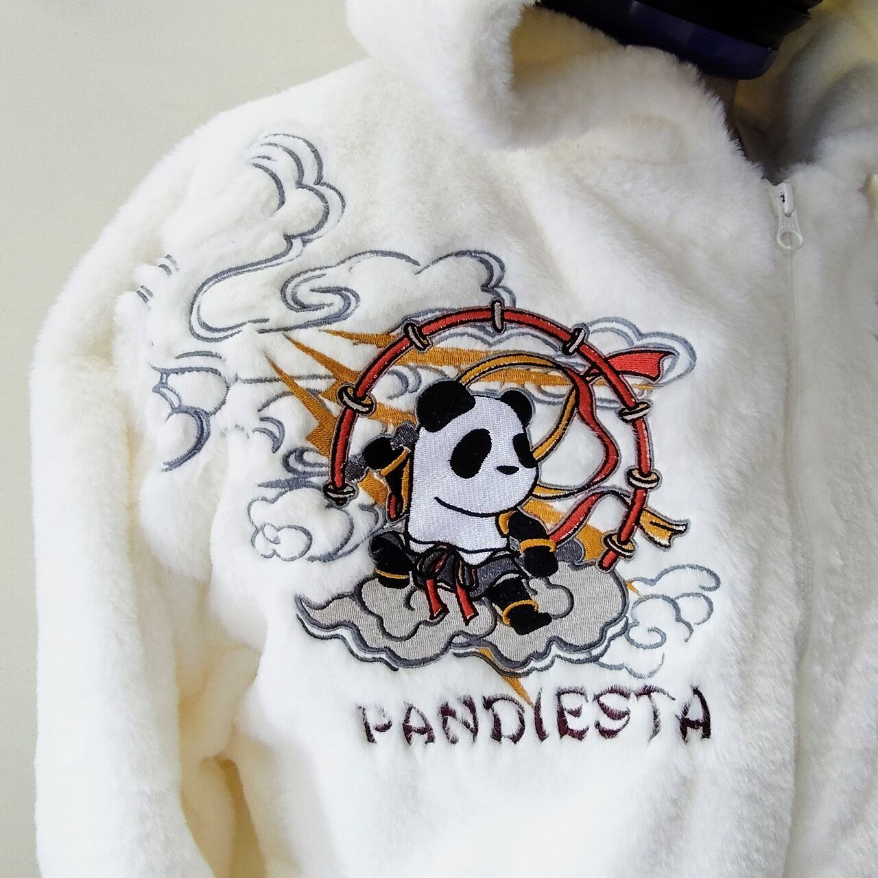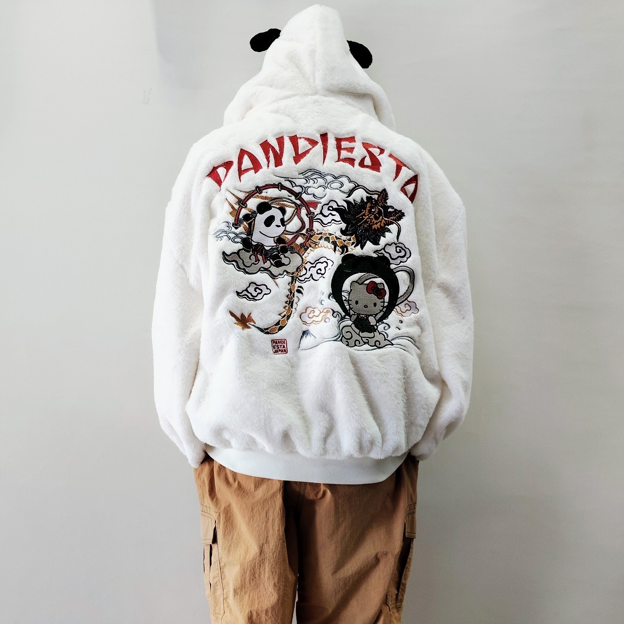 この特別なパーカーは、パンディエスタとKITTYとの魅力的なコラボレーションにより、風神雷神に変身したパンダとキティがデザインされています。