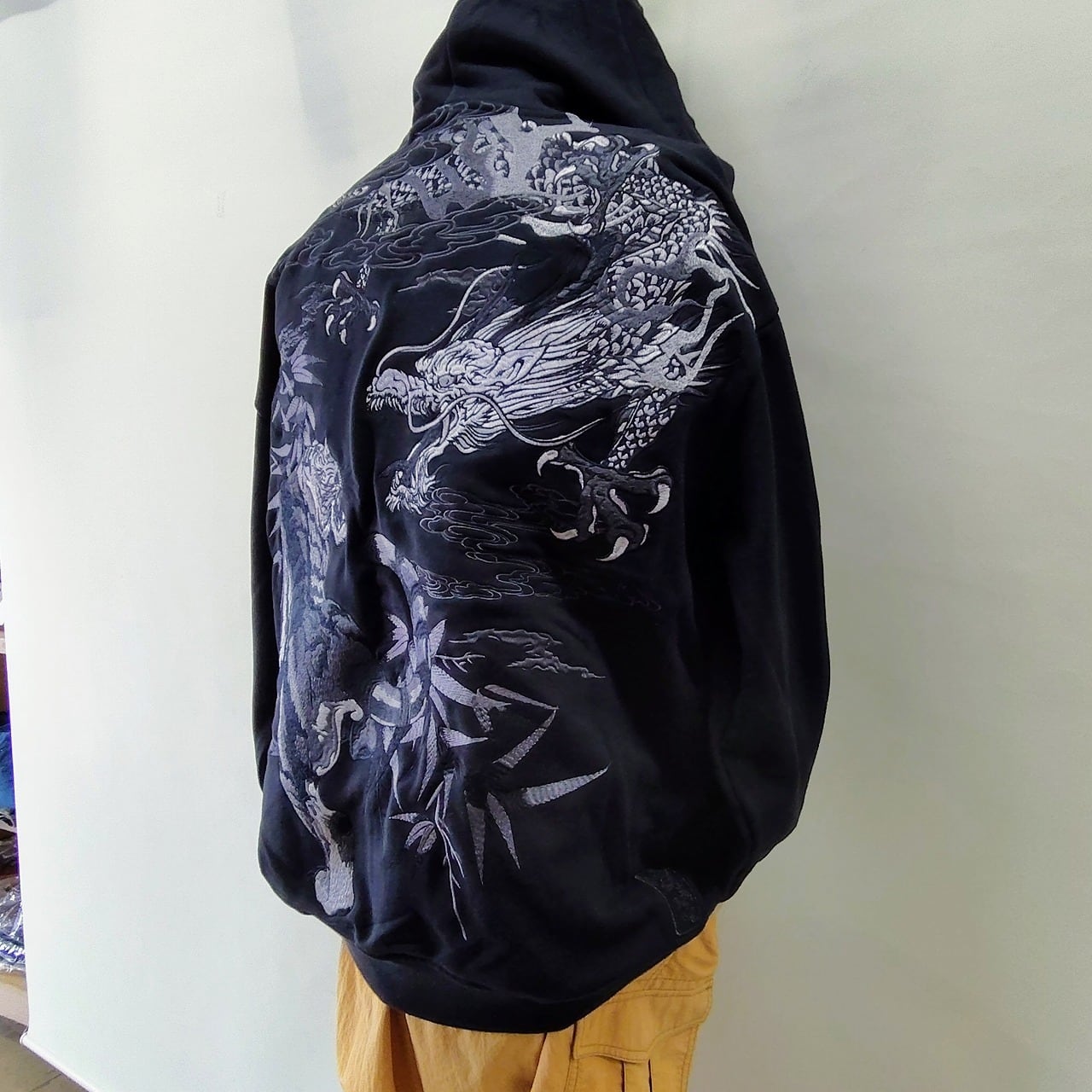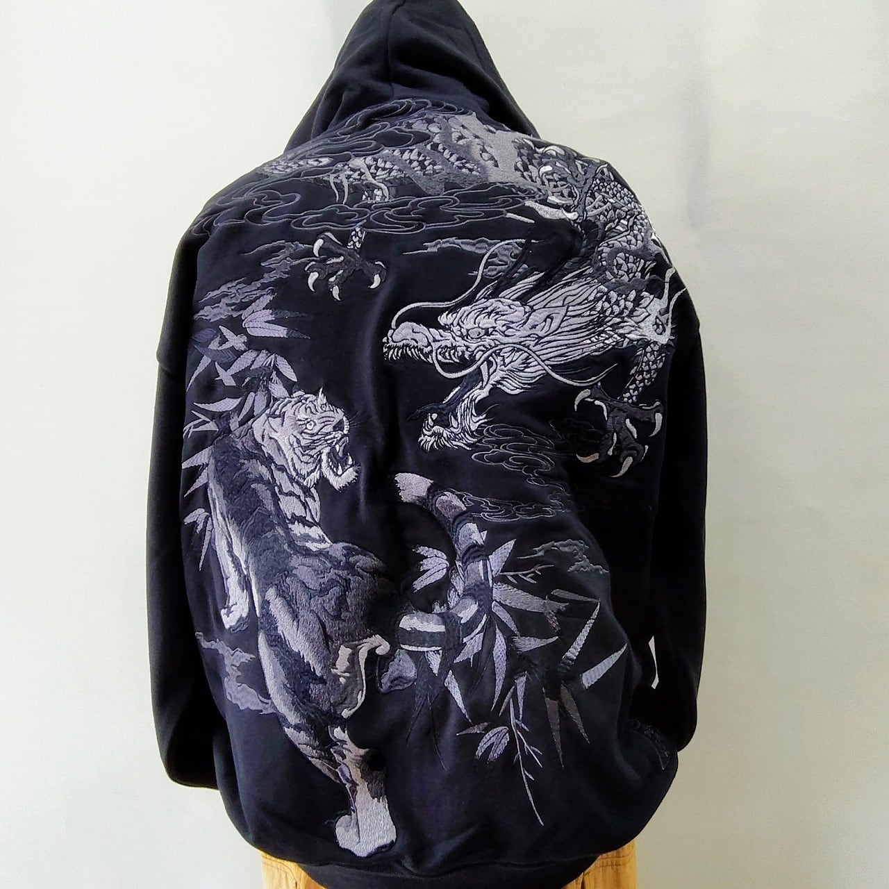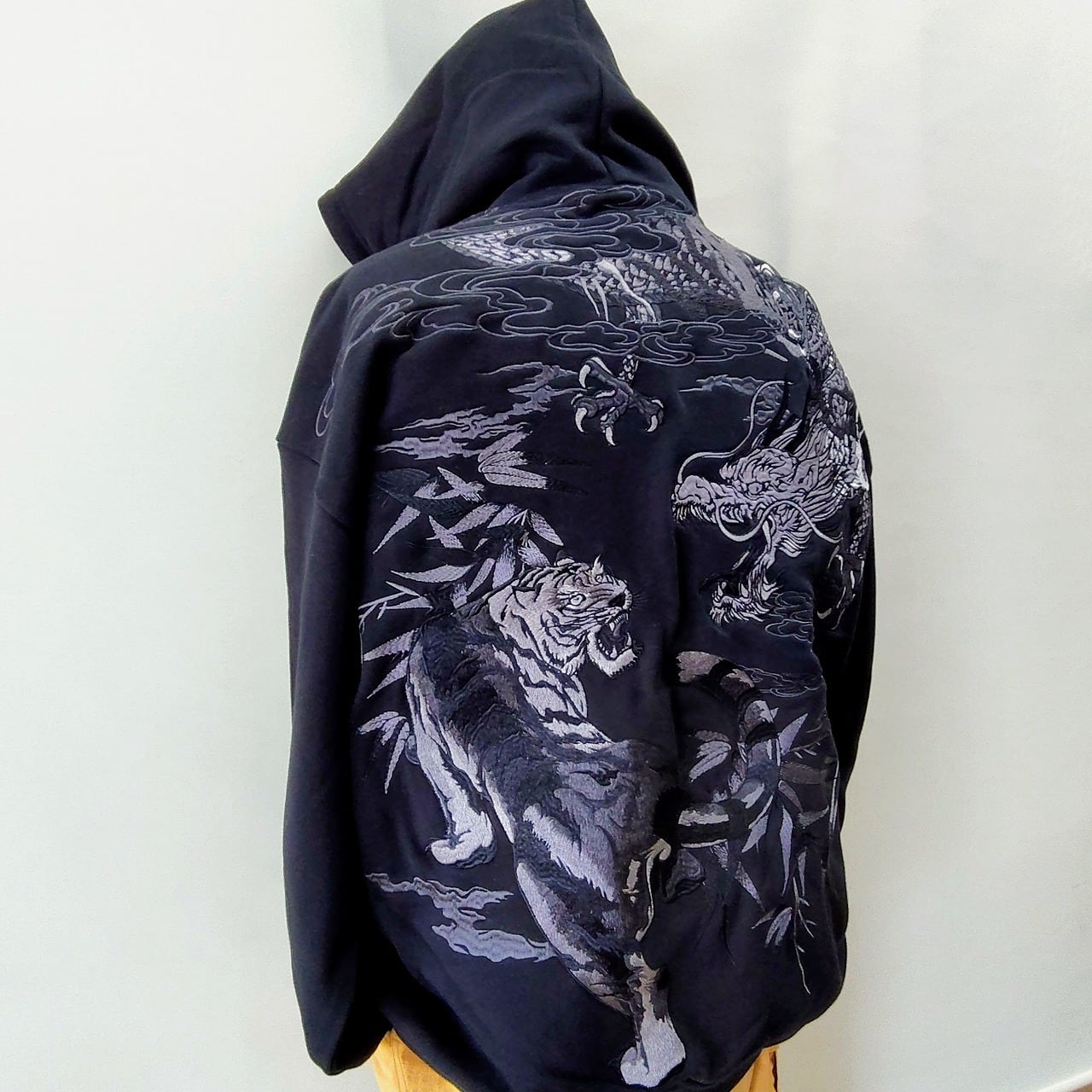 この特別なパーカーは、背中に迫力のある龍とトラの刺繍が施され、シックなグレーの糸がデザインのアクセントになっています。