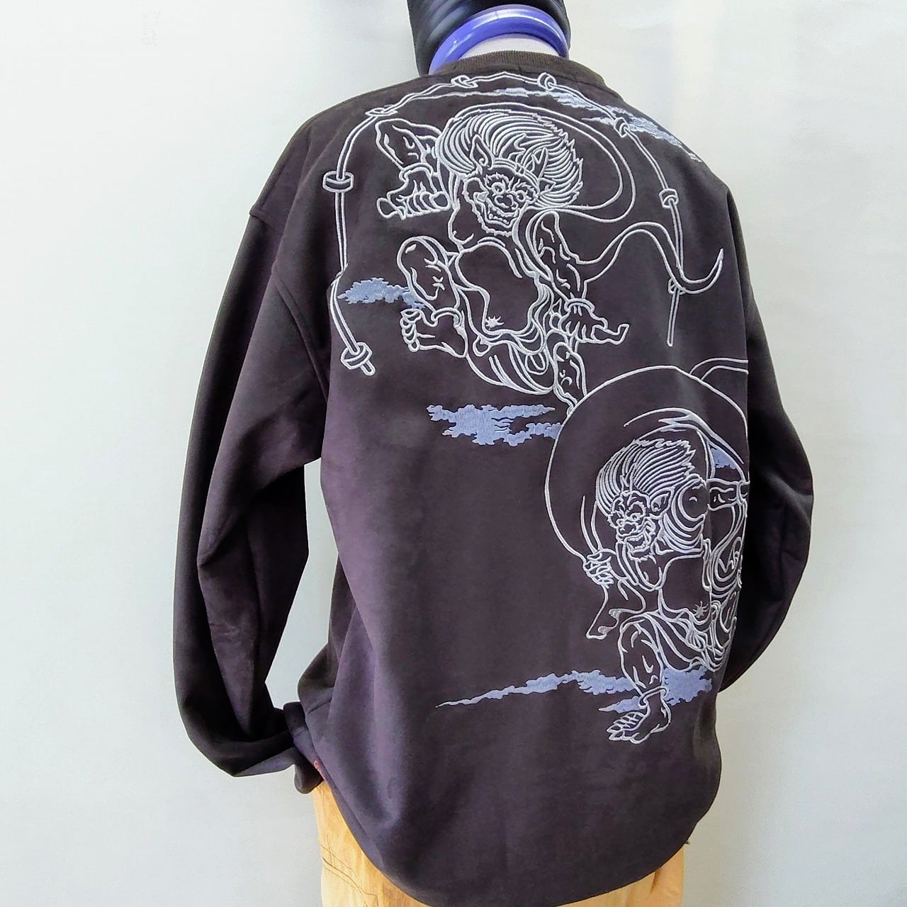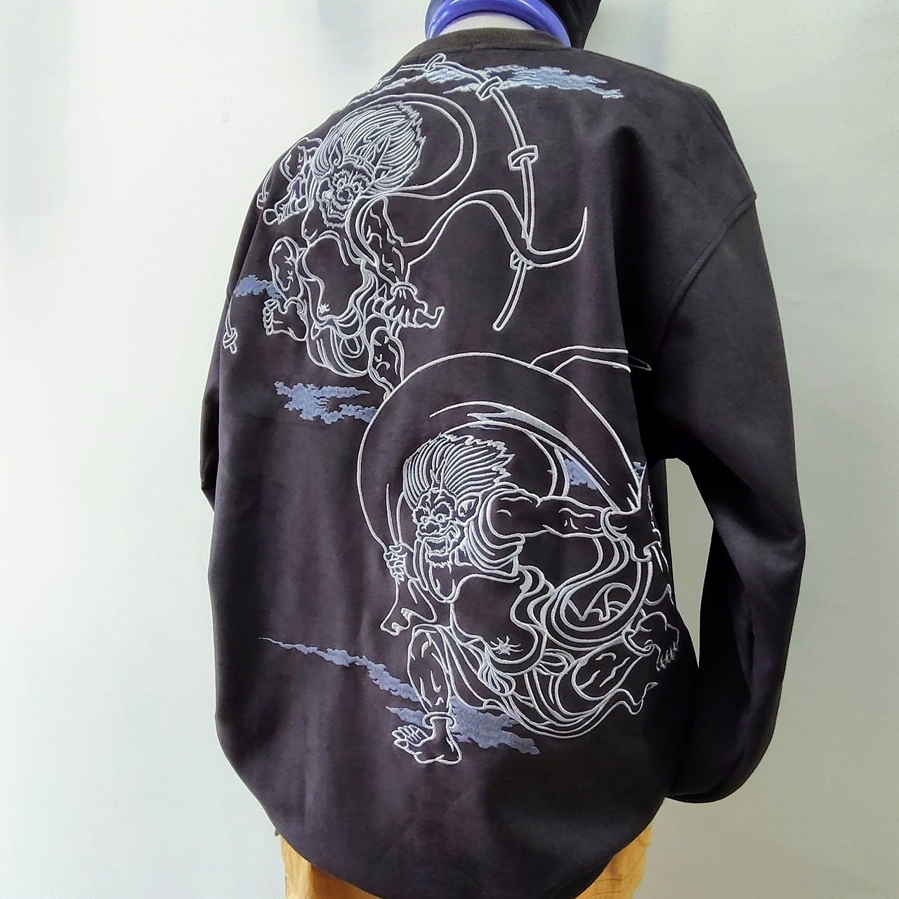 この特別な長袖Tシャツは、背中に迫力のある風神雷神の刺繍が施され、シルバーの糸がデザインのアクセントとなっています。