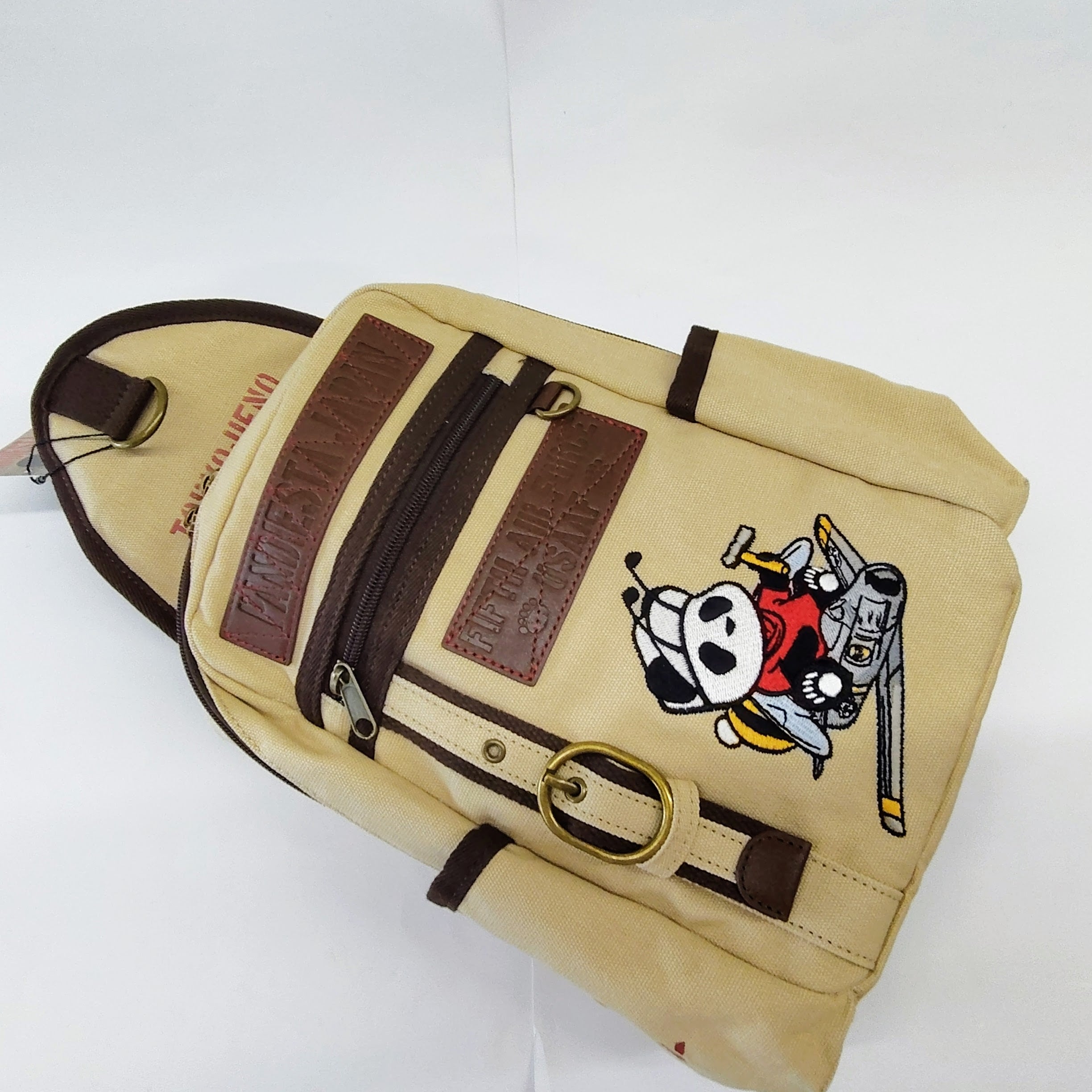 この特別なボディバッグは、かわいらしいパンダが飛行機に乗っている刺繍が施されており、シンプルなベージュのデザインが使いやすさを引き立てています。