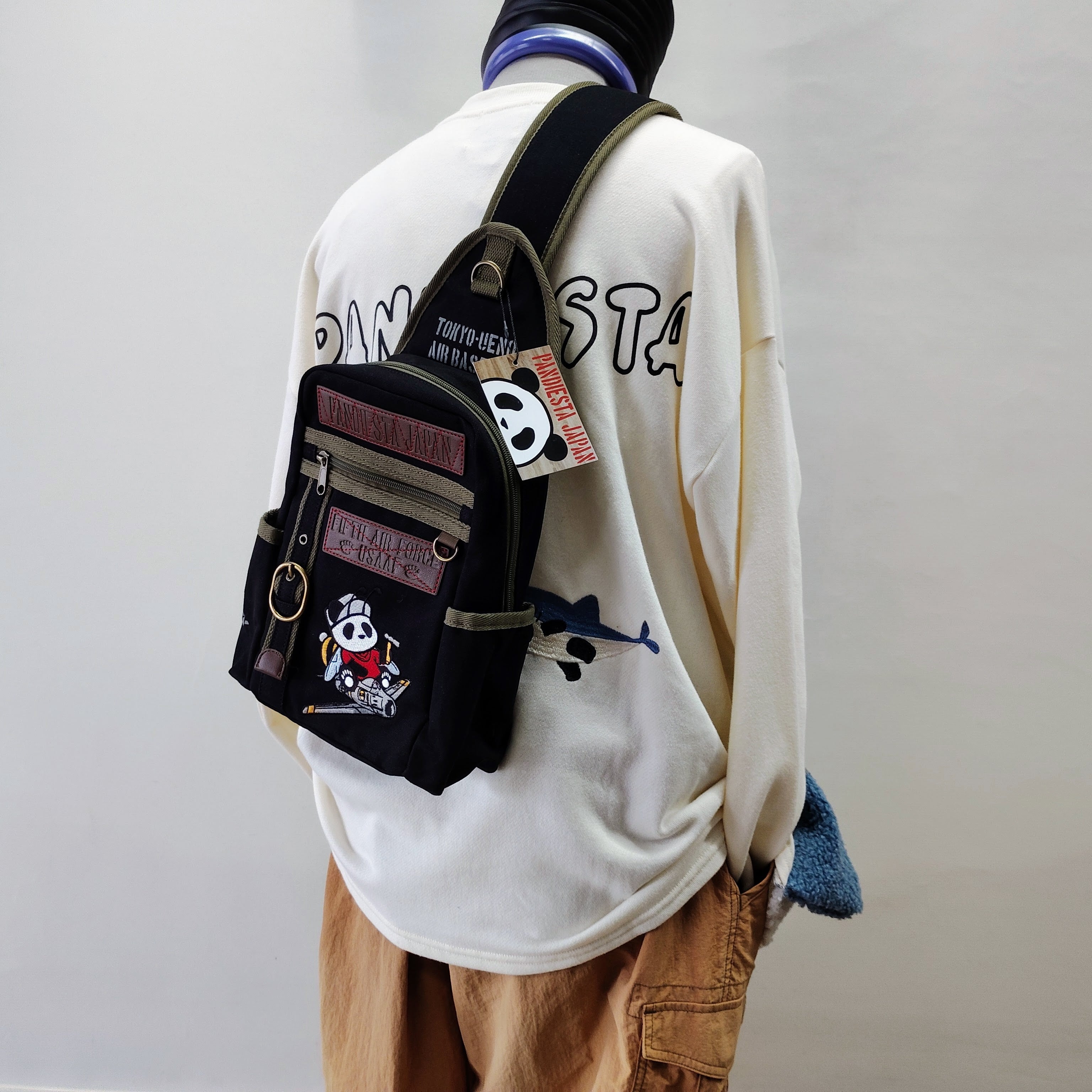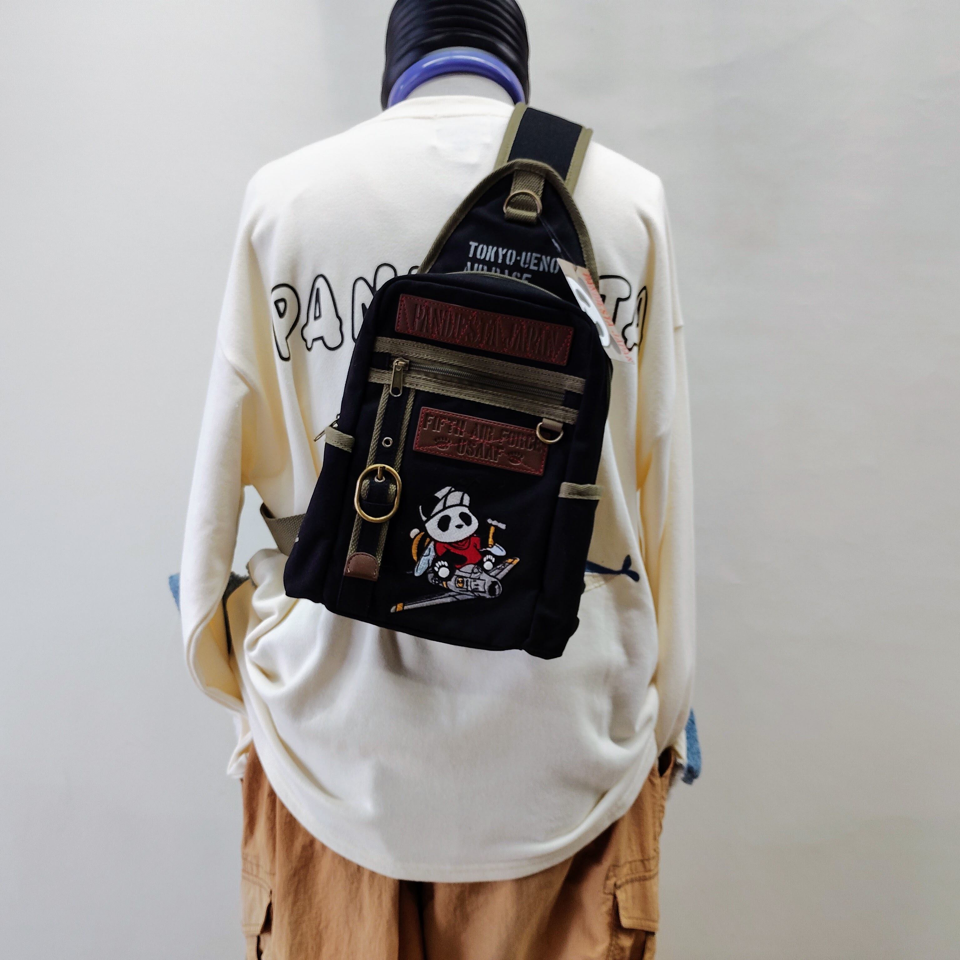 Elevate your style with the "パンディエスタ ボディバッグ 飛行機パンダ 黒" — a statement piece for your wardrobe!