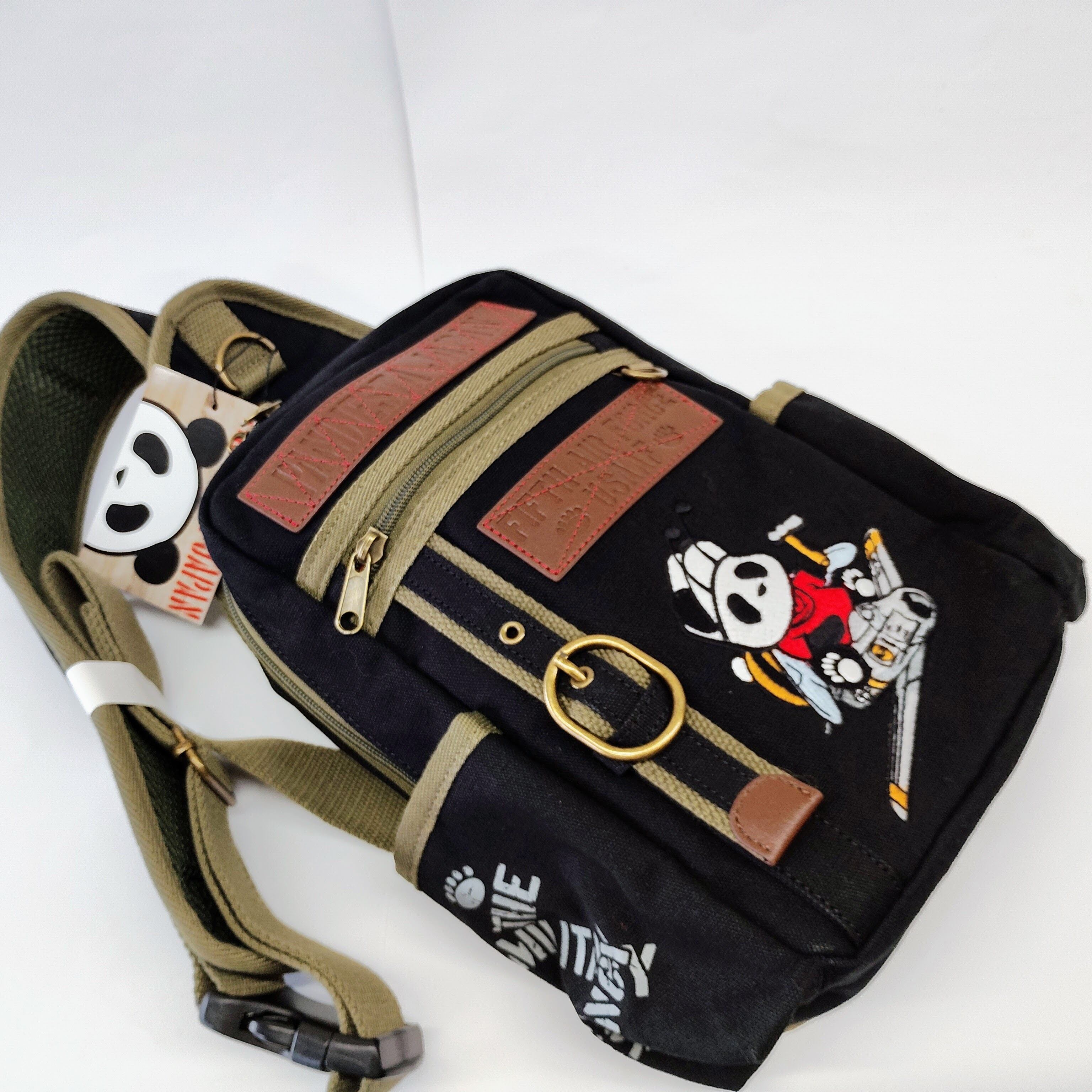 この特別なボディバッグは、かわいらしいパンダが飛行機に乗っている刺繍が施されており、シンプルな黒のデザインが使いやすさを引き立てています。