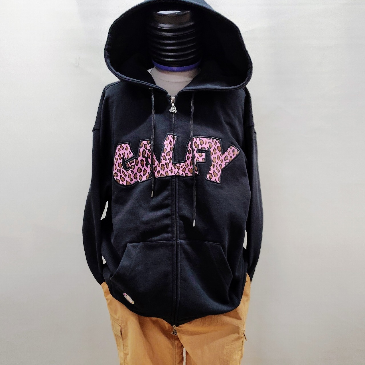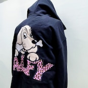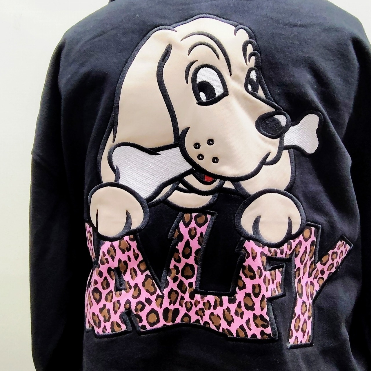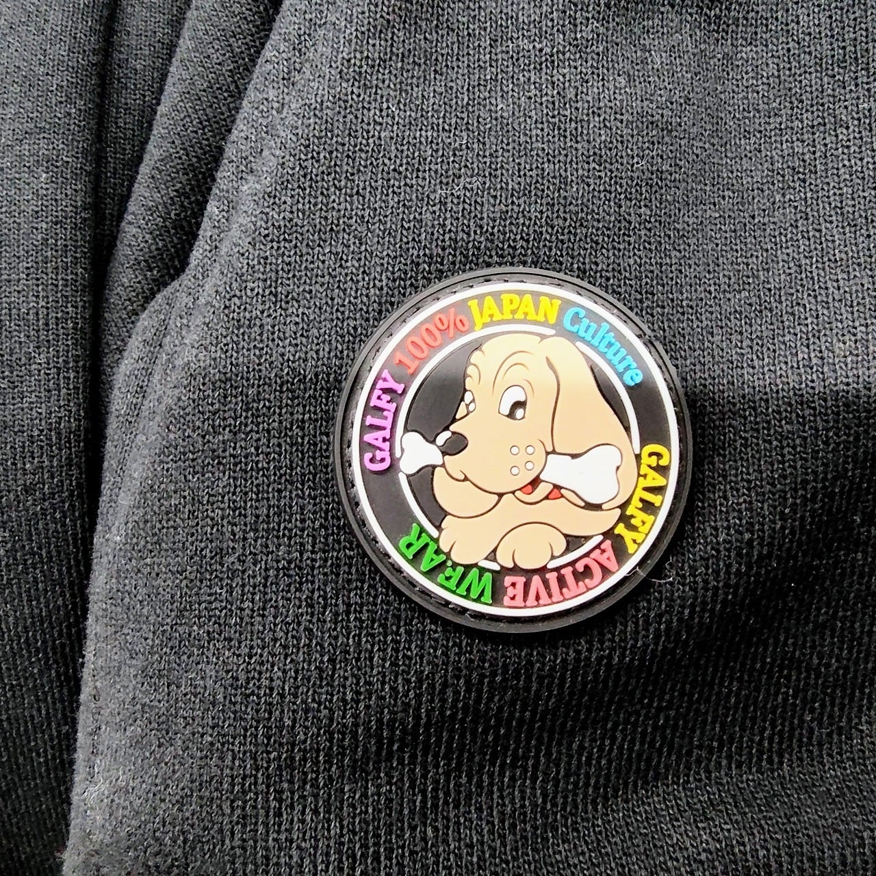 こちらのパーカーは、背中に大きなガルフィーの顔があしらわれており、GALFYの文字はリメイク風に別布が使われているユニークなデザインが魅力です。