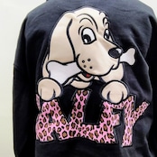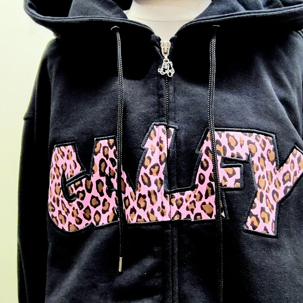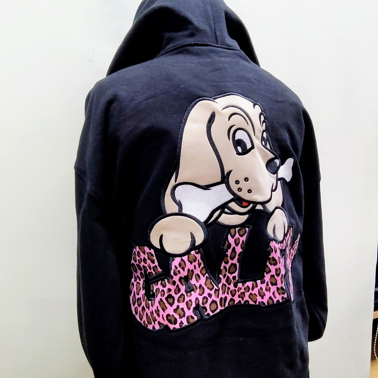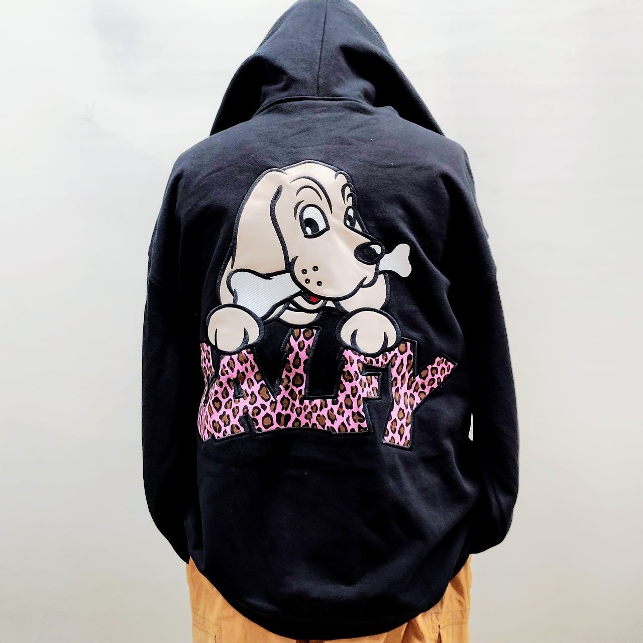 こちらのパーカーは、背中に大きなガルフィーの顔があしらわれており、GALFYの文字はリメイク風に別布が使われているユニークなデザインが魅力です。
