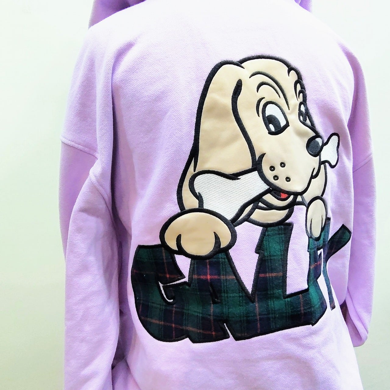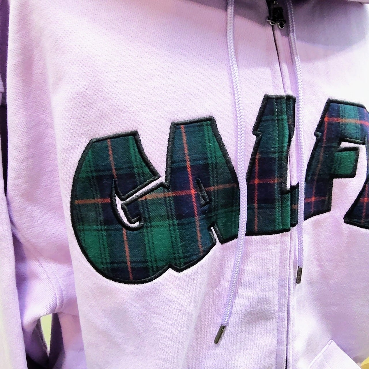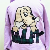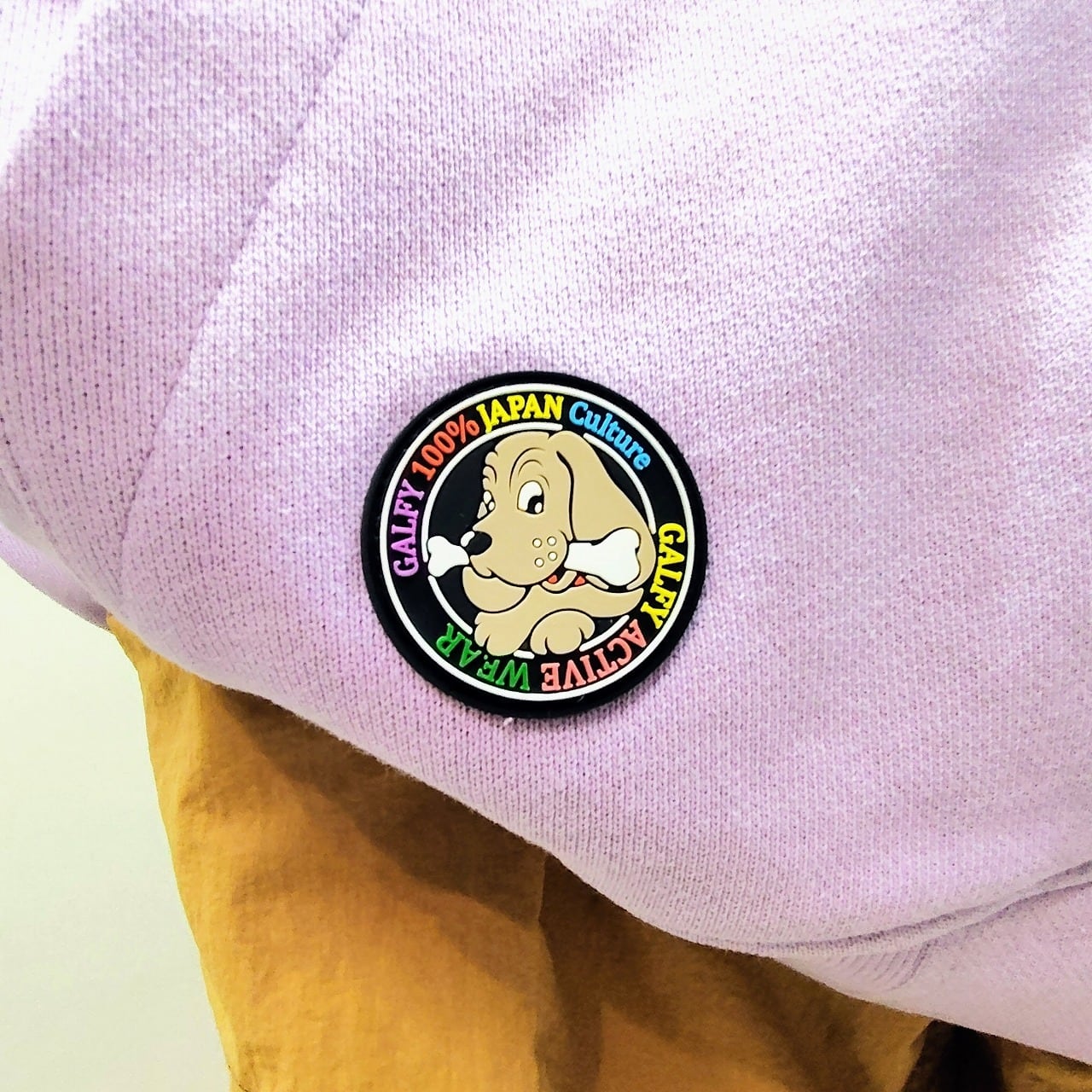 こちらのパーカーは、背中に大きなガルフィーの顔があしらわれており、GALFYの文字はリメイク風に別布が使われているユニークなデザインが魅力です。