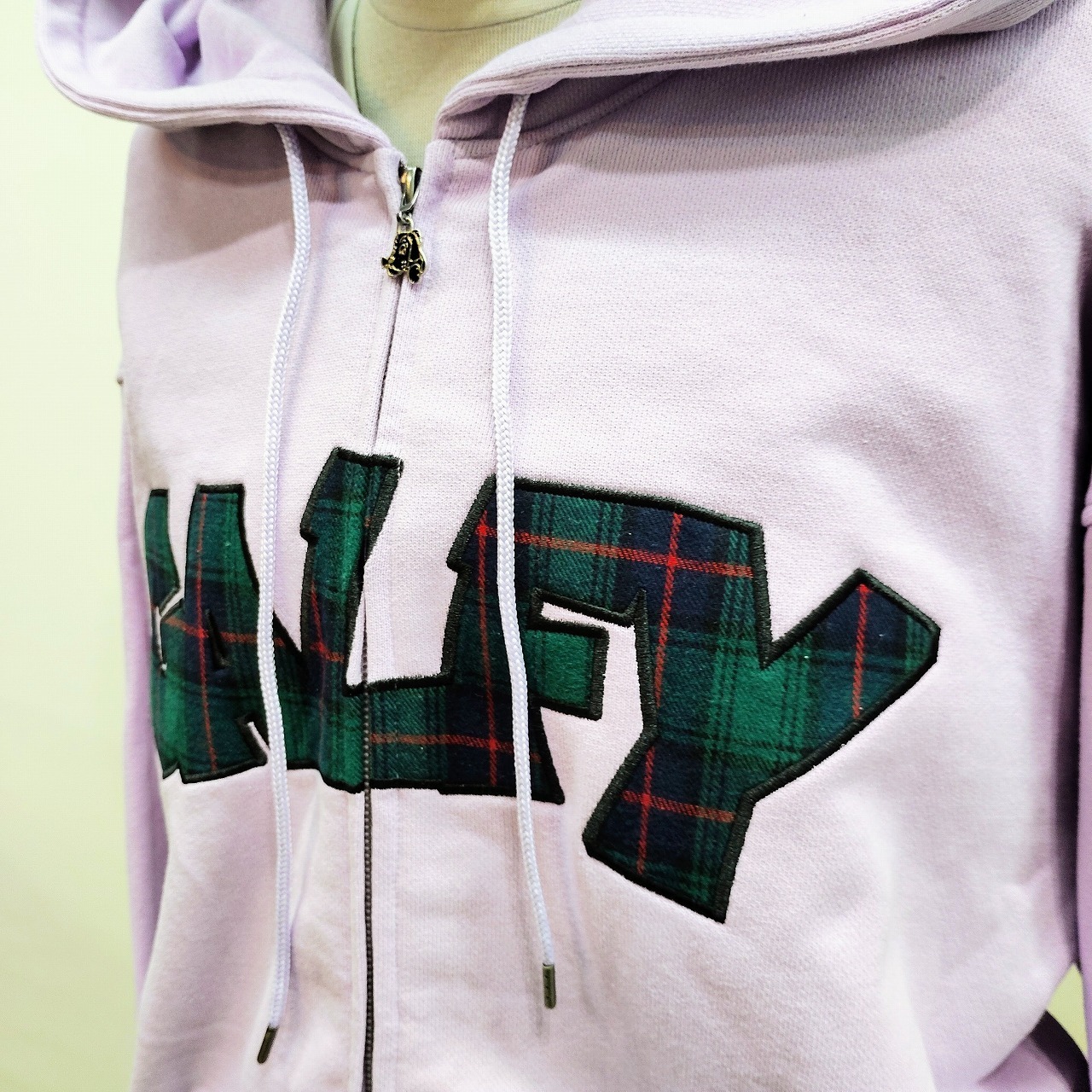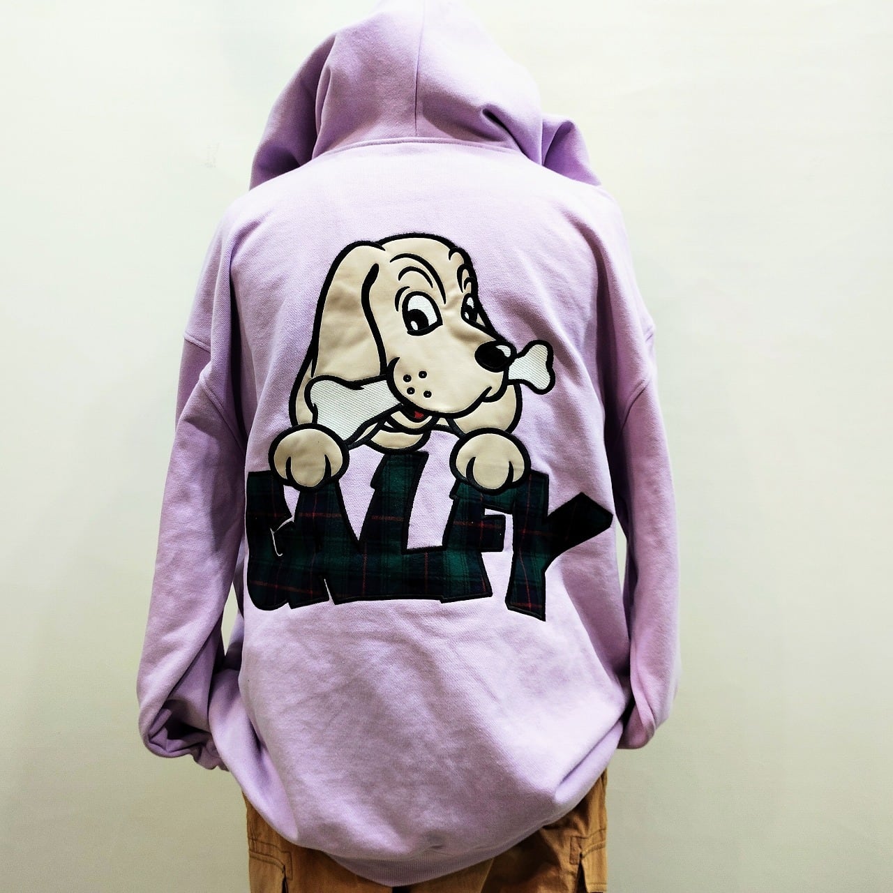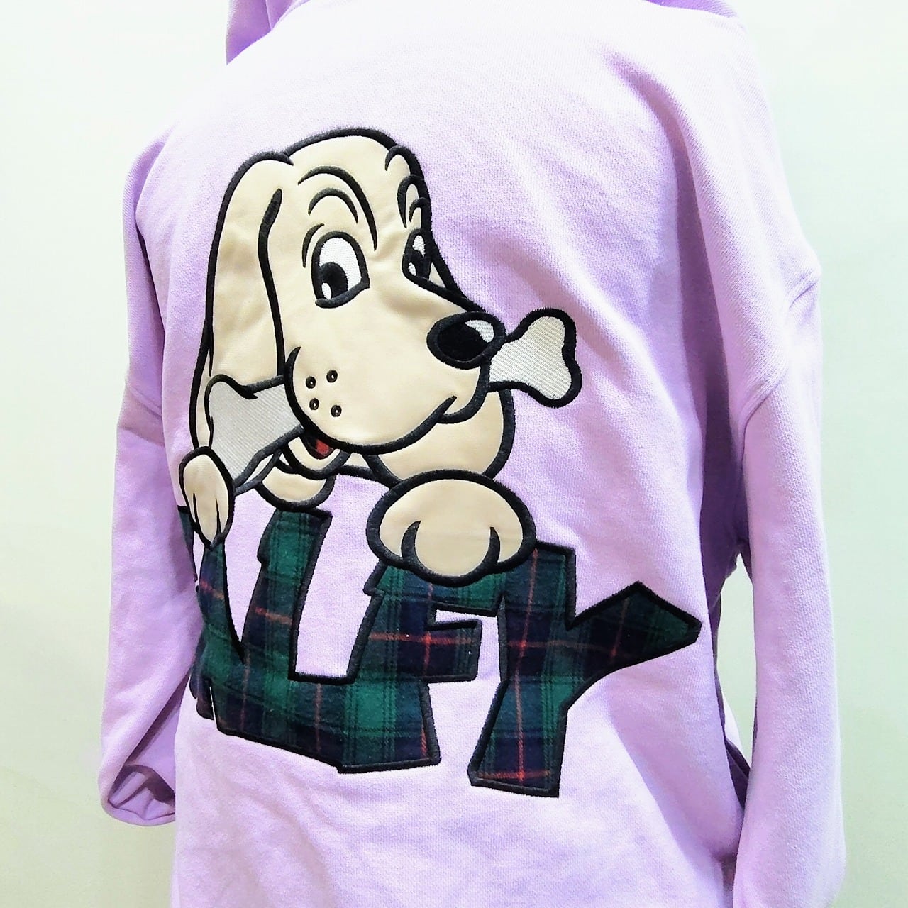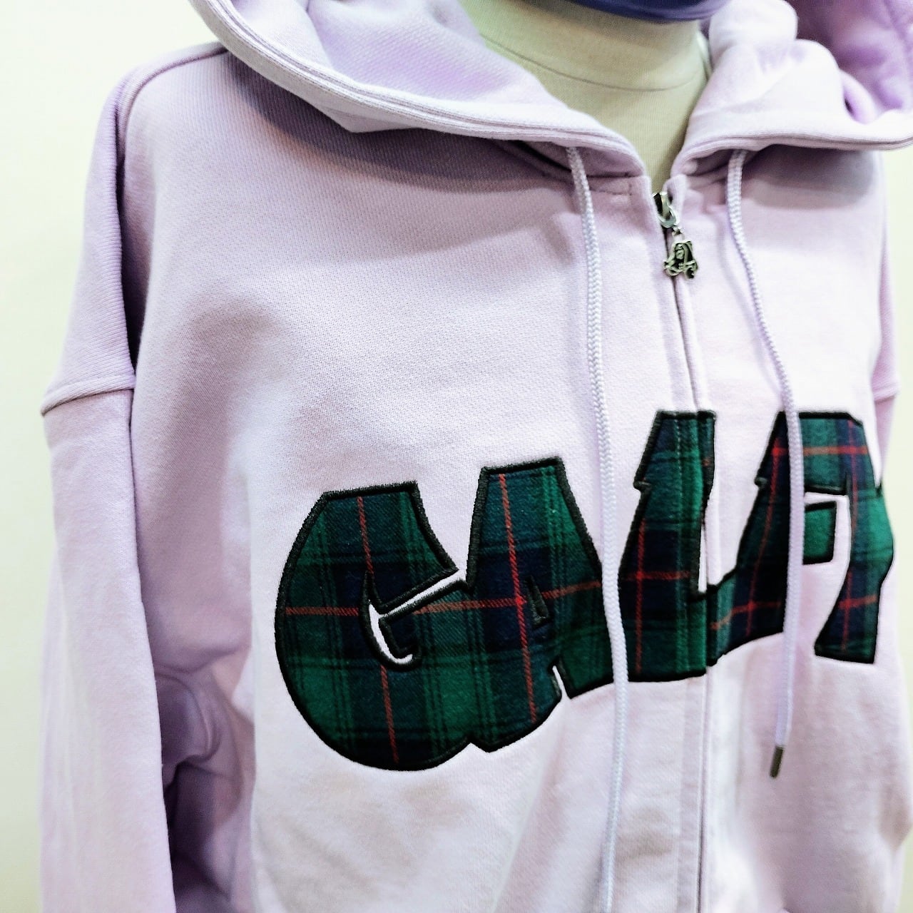 こちらのパーカーは、背中に大きなガルフィーの顔があしらわれており、GALFYの文字はリメイク風に別布が使われているユニークなデザインが魅力です。