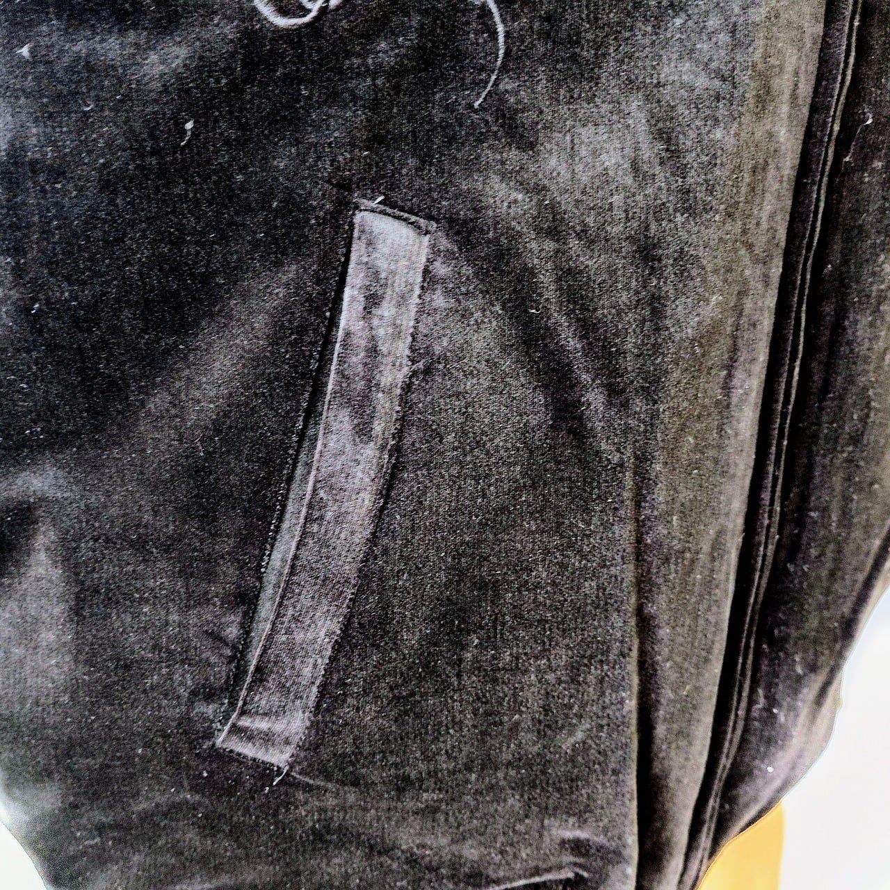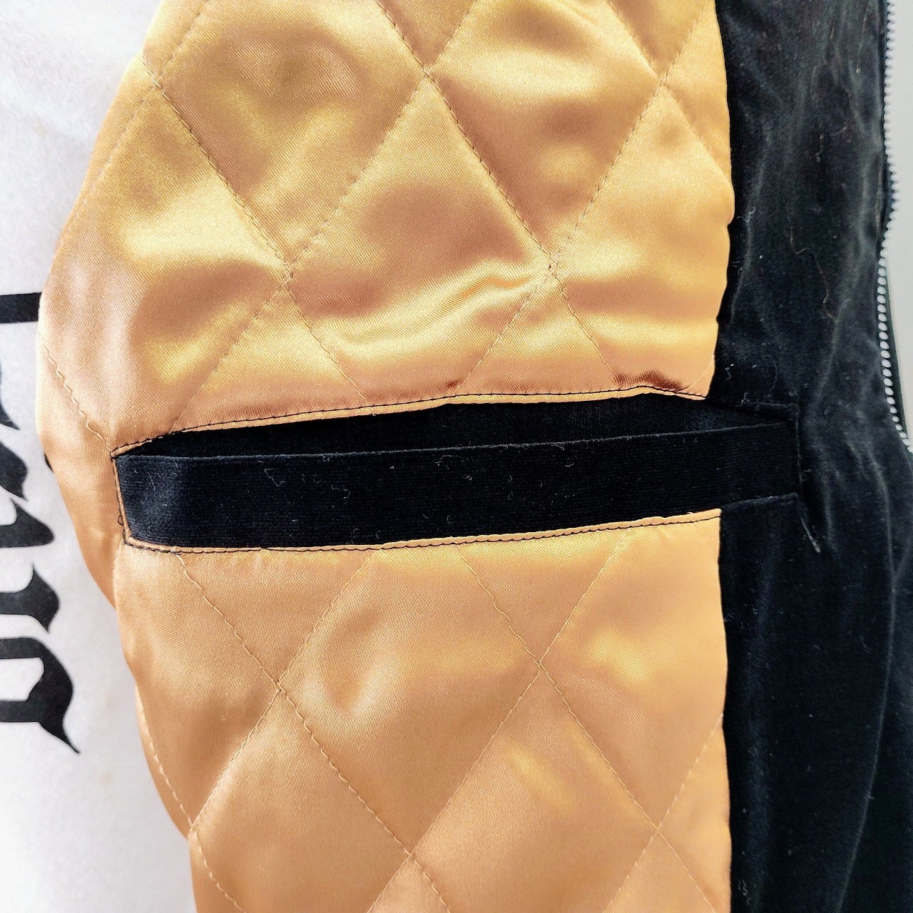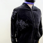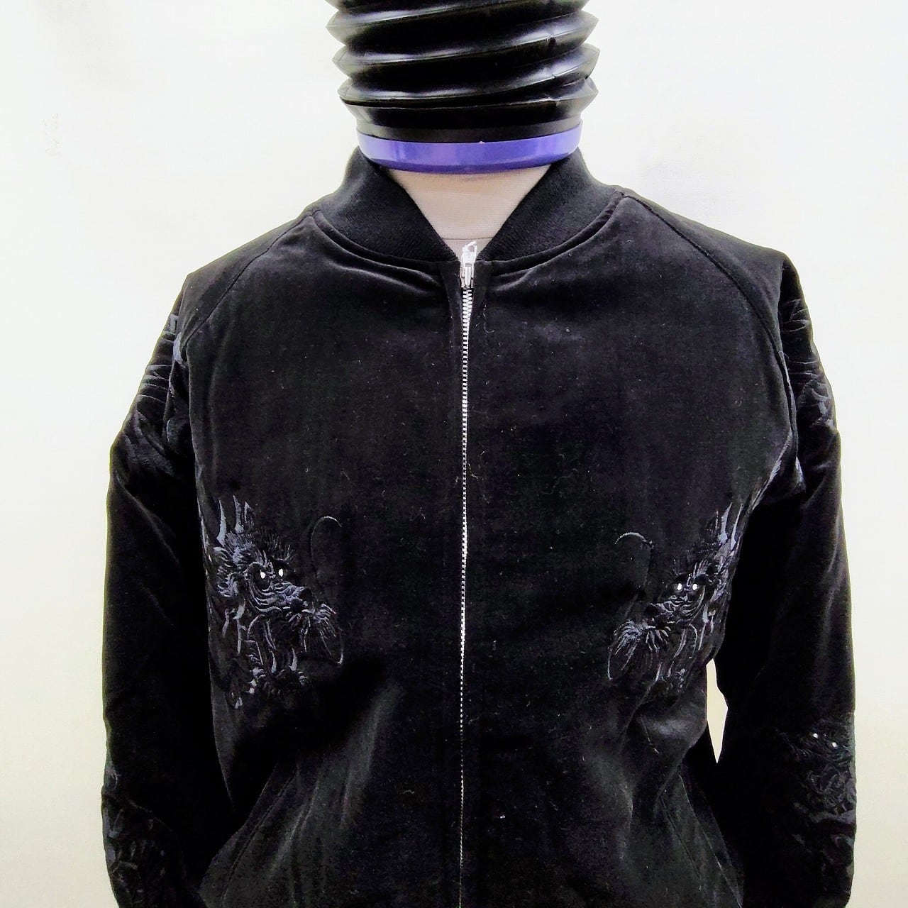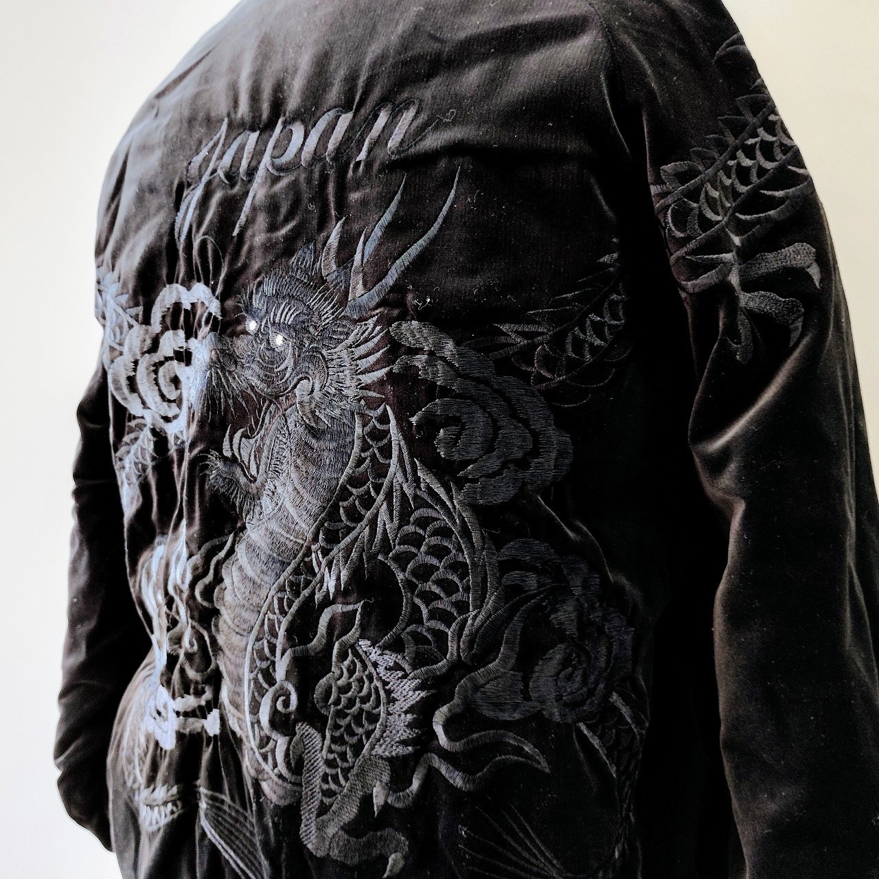 こちらのスカジャンは、別珍素材を使用し、黒地に黒糸の刺繍が施されたシンプルでありながらも存在感のあるデザインが魅力です。