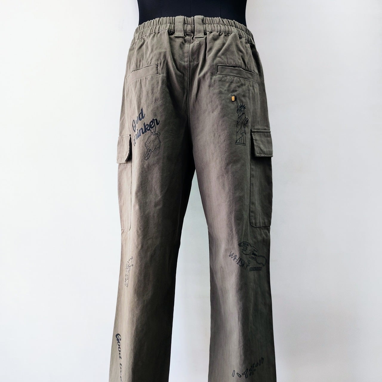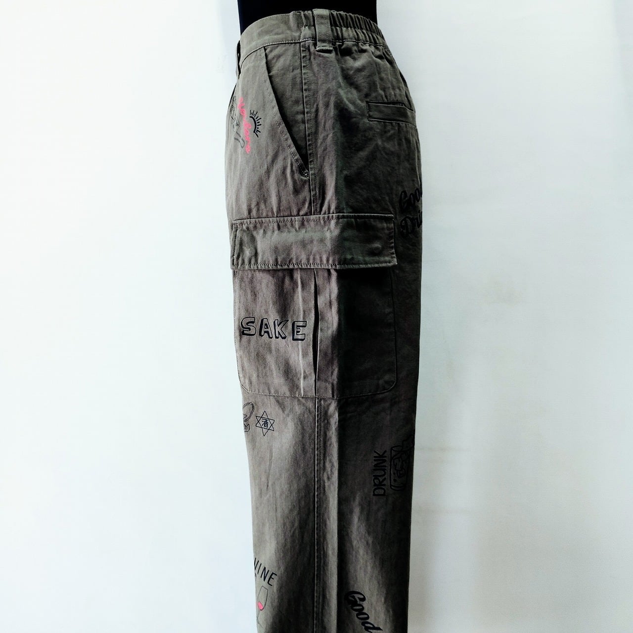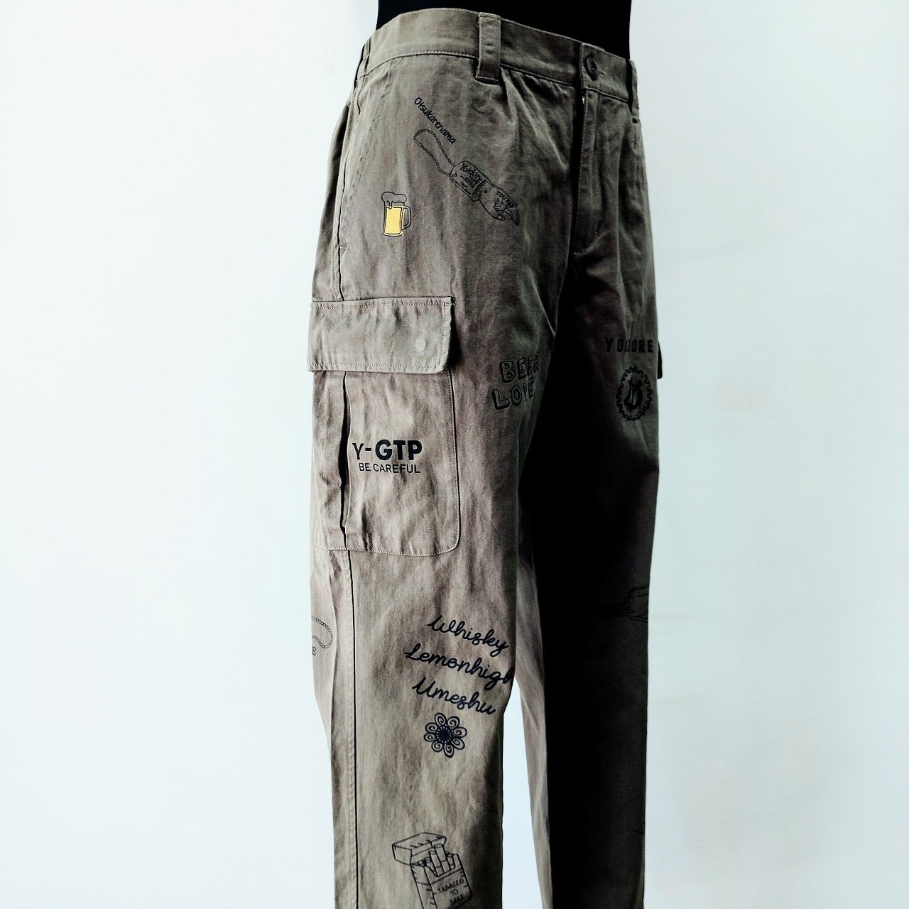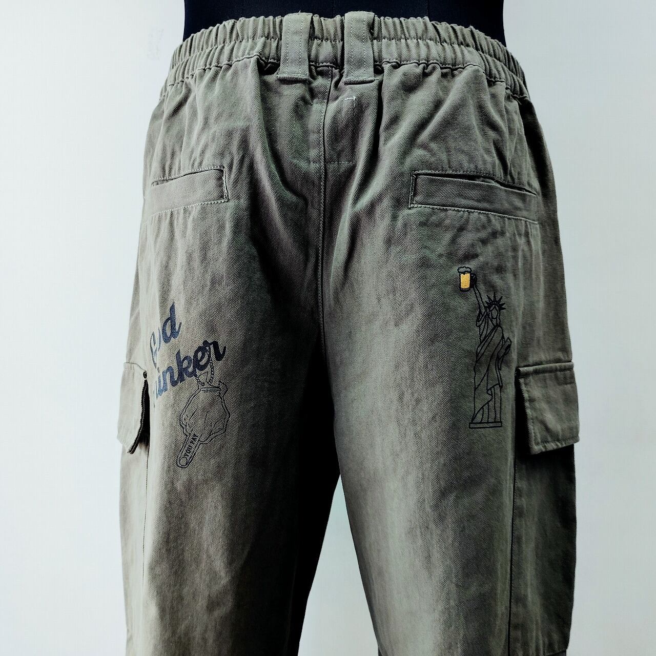 こちらのカーゴパンツは、ユニークな落書きプリントが施されたデザインが特徴で、お酒を愛するあなたにぴったりのアイテムです!