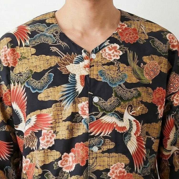 「鯉口(こいくち)ダボシャツ ツル亀プリント 黒地 festival clothes 大」で、あなたのスタイルにお祭りの情熱をプラスしてみませんか!