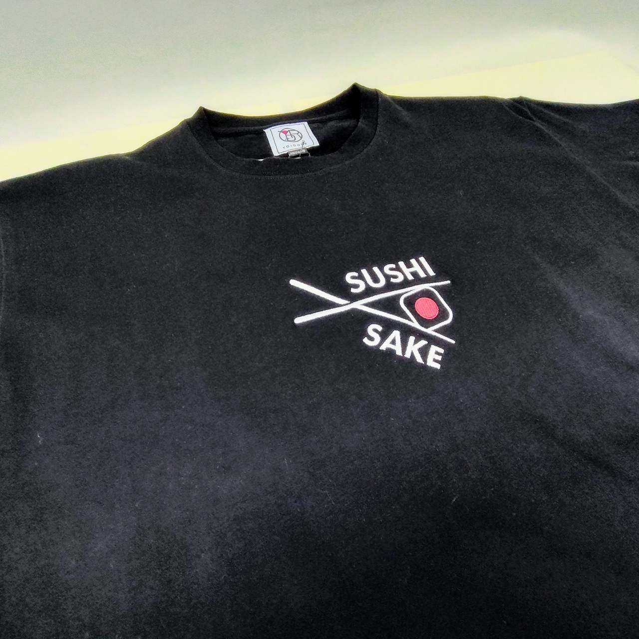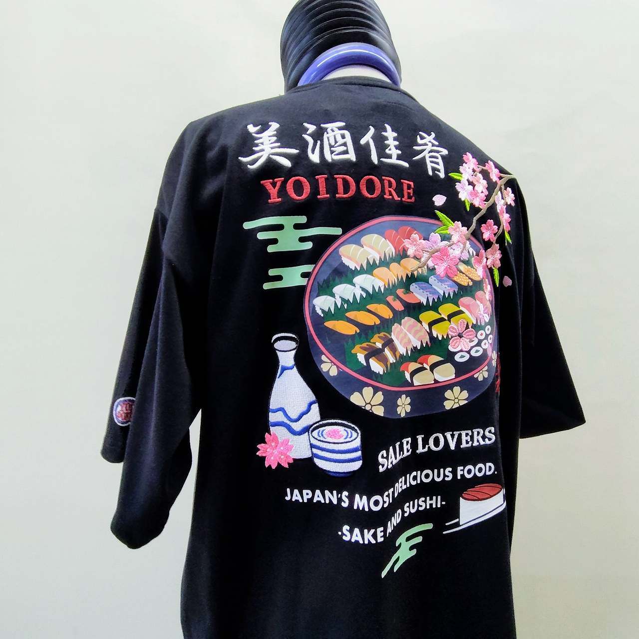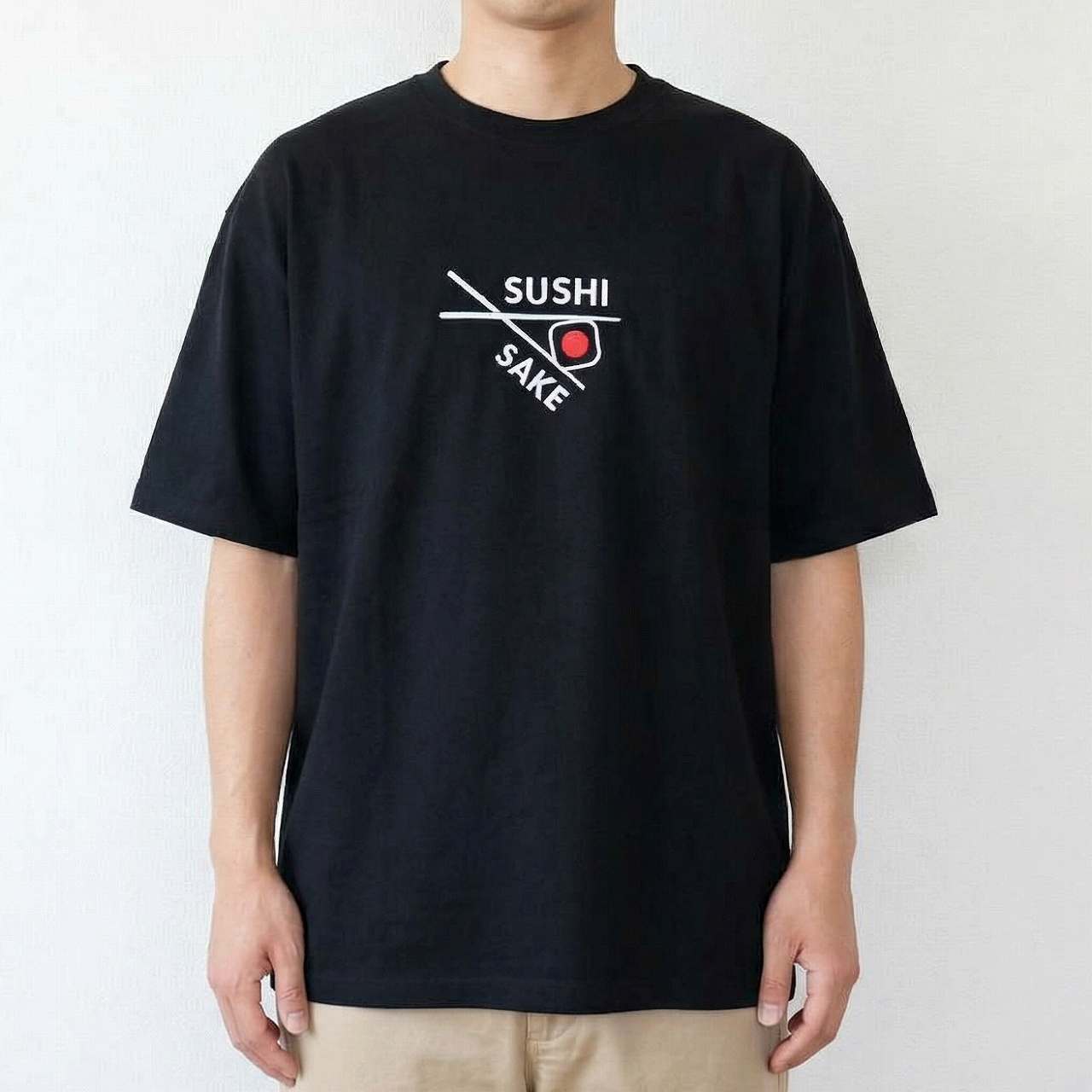 美酒佳肴の魅力が詰まったこのTシャツは、背中に鮨と桜、日本酒が表現された特別なデザインです。