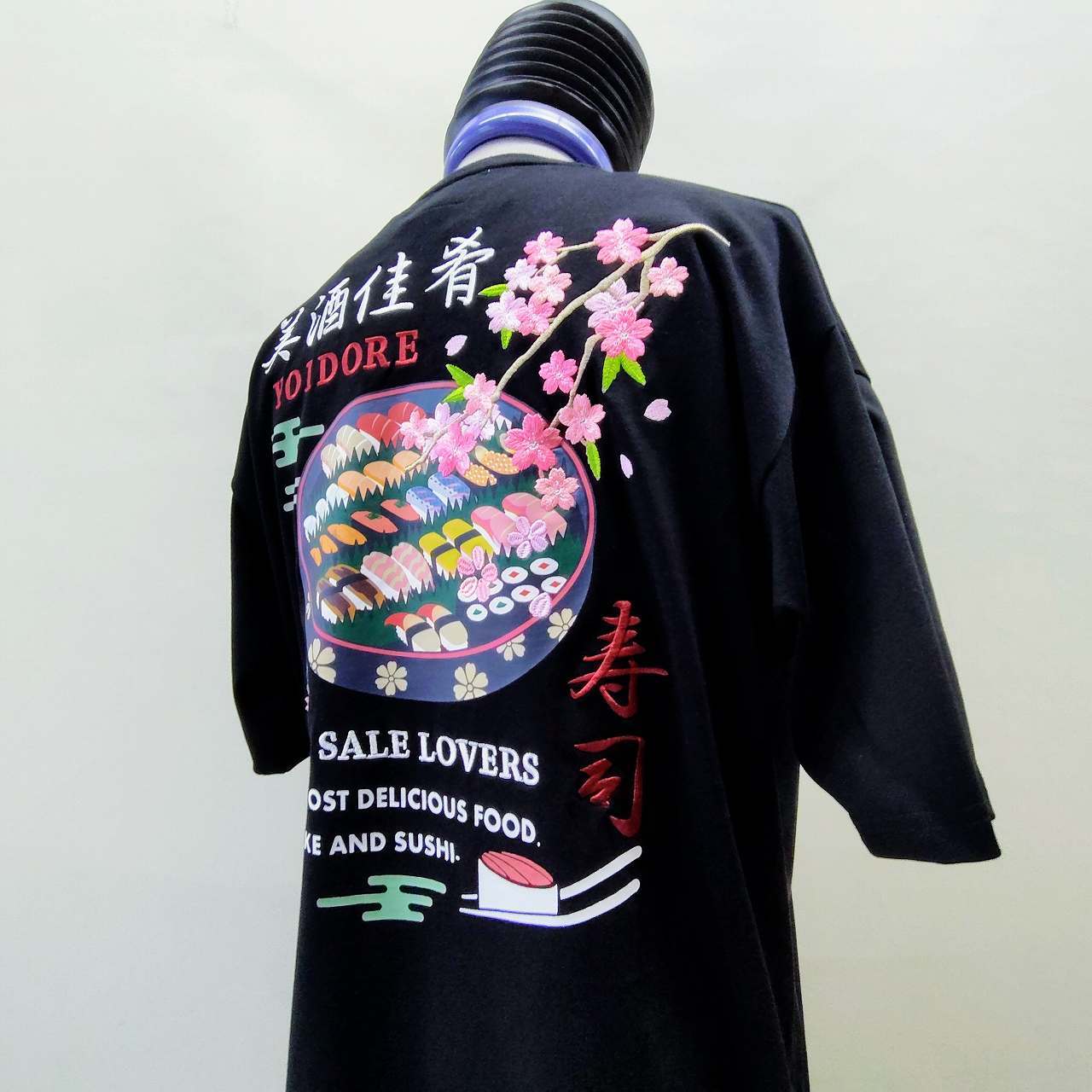 黒に映える華やかな鮨と桜のデザインは、シンプルながらも存在感があり、多様なコーディネートで活躍するアイテムです。