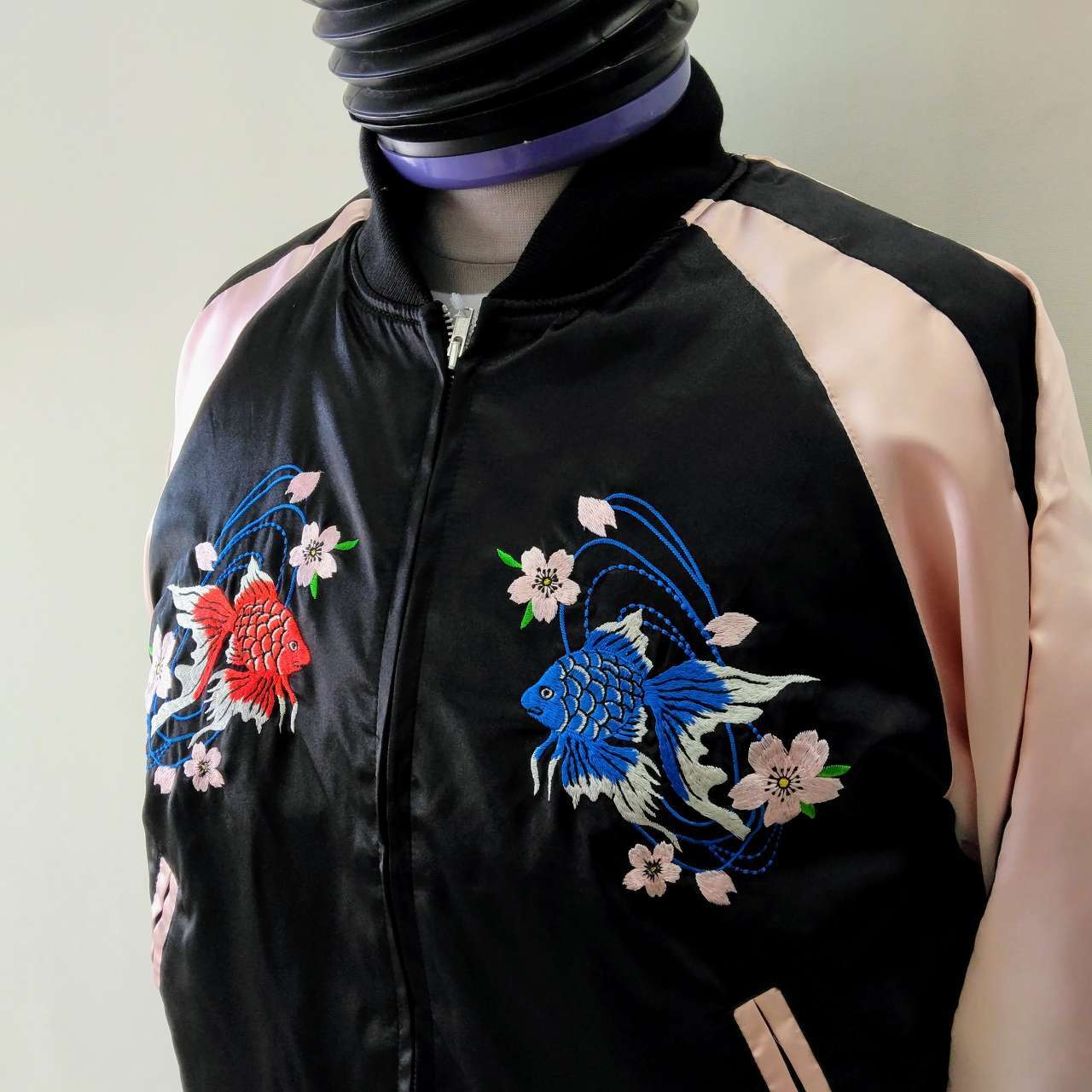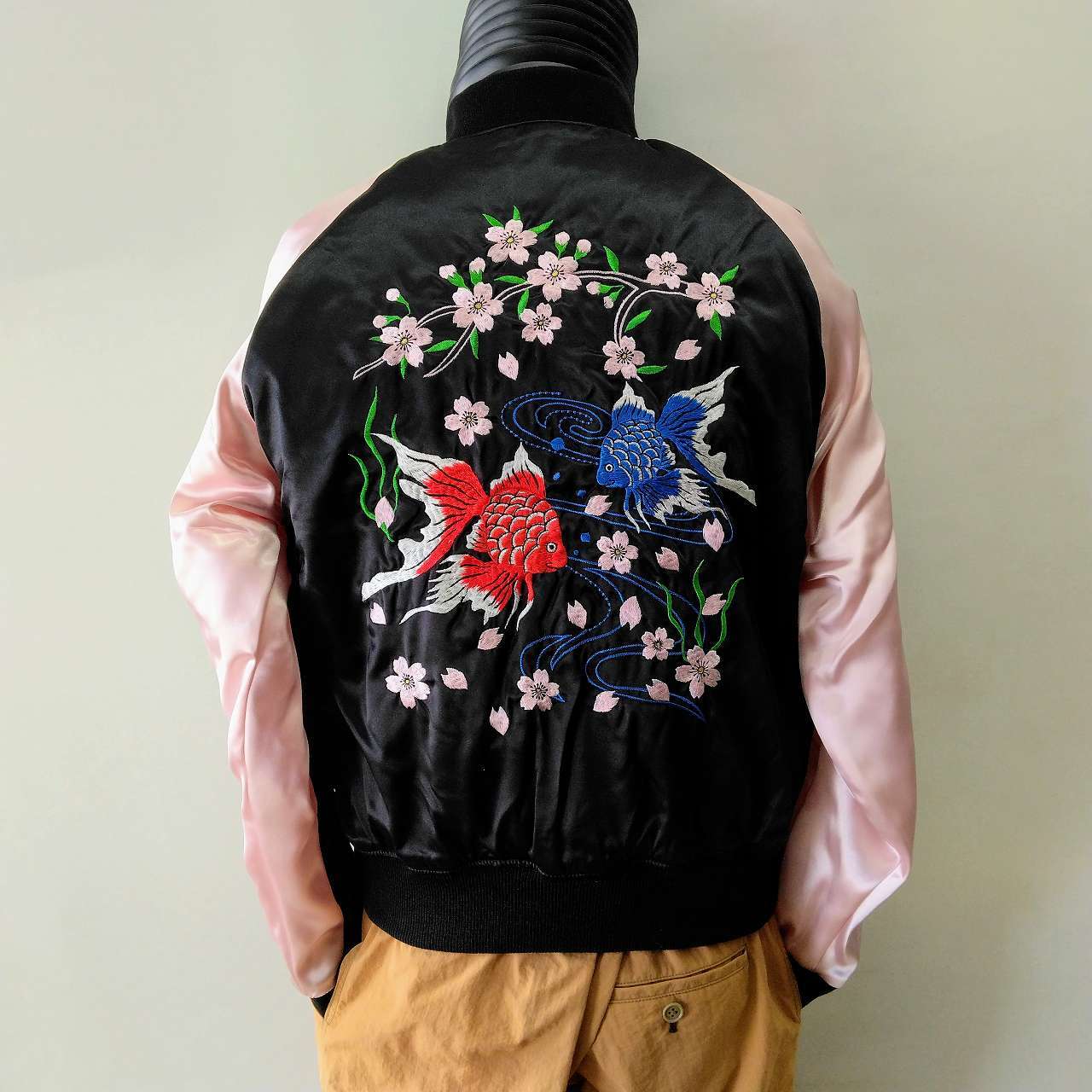 華やかな桜の花と鮮やかな赤と青の金魚が背中に刺繍されたスカジャン。