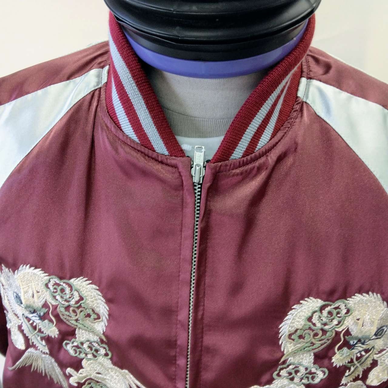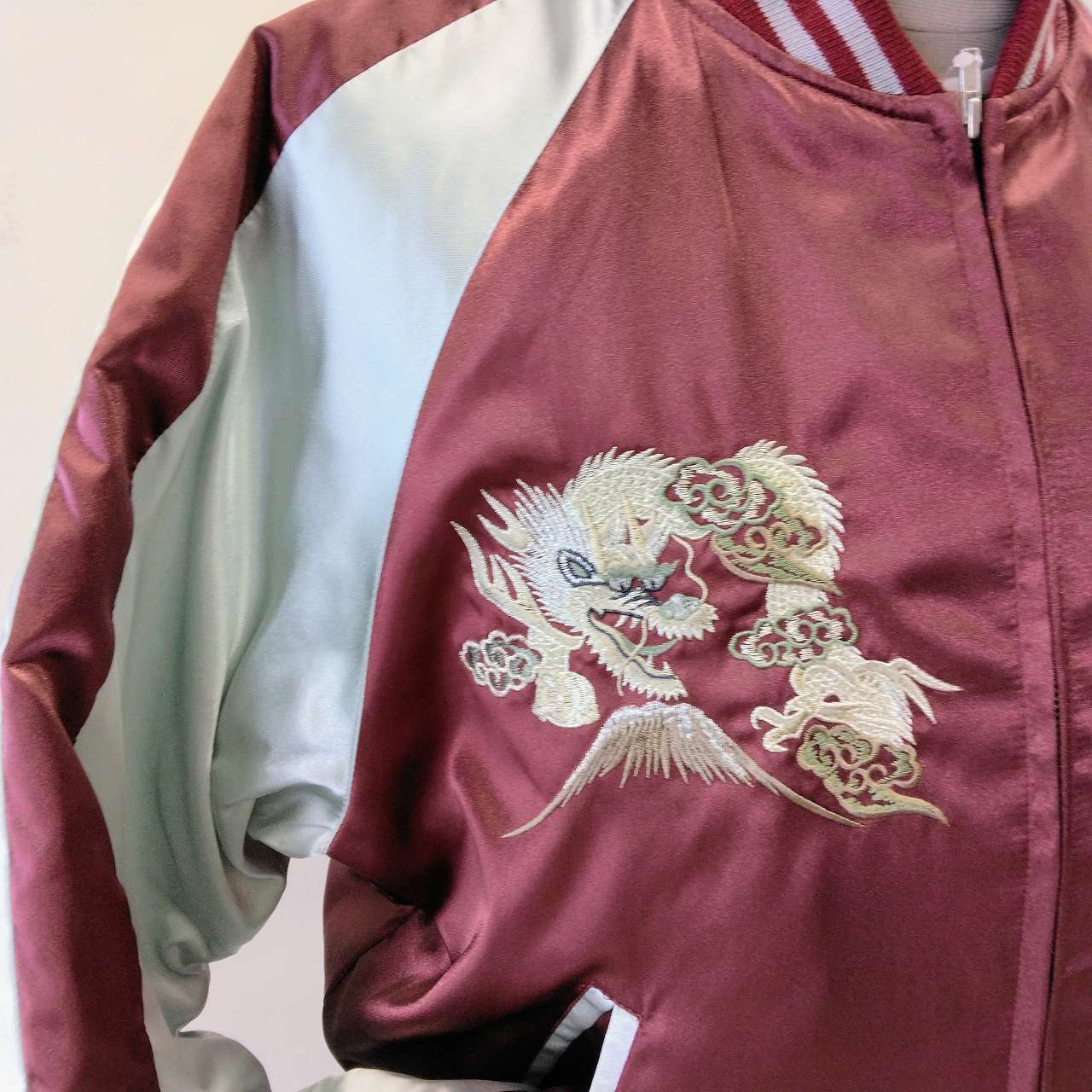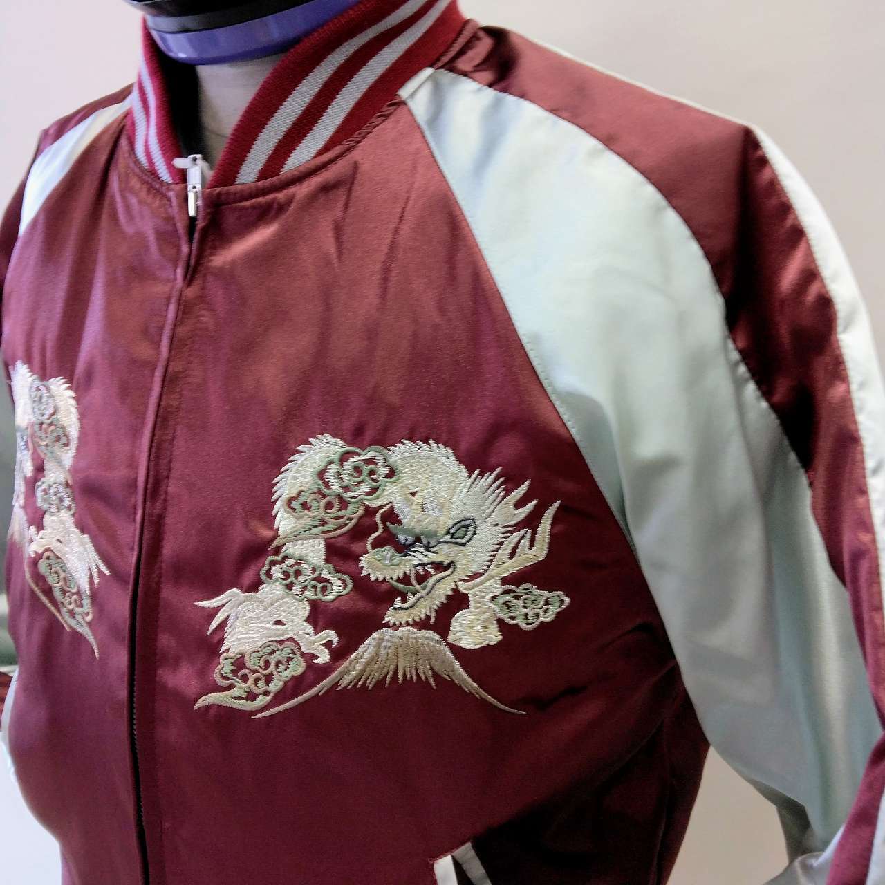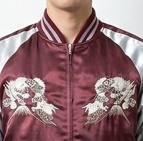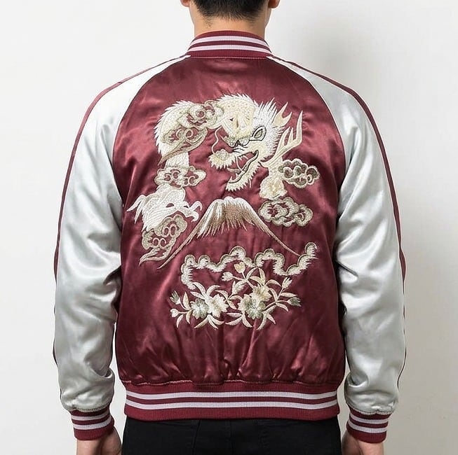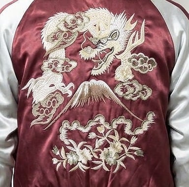 This jumper is embroidered with flowers, Mt. Fuji and a dragon on its back.