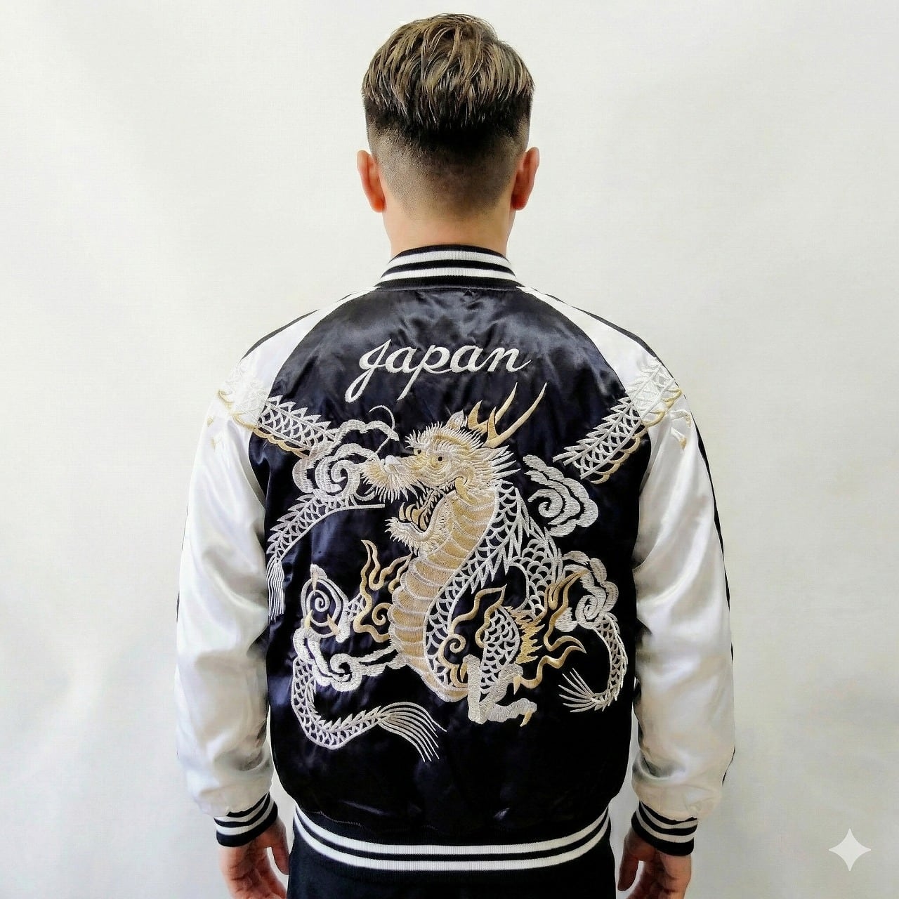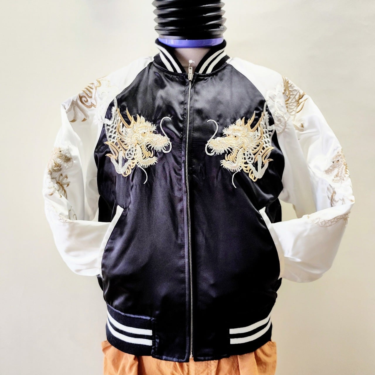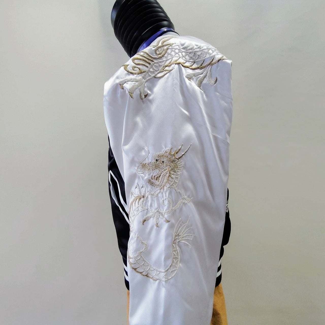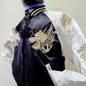 こちらのスカジャンは、豪華な双竜刺繍が特徴です! 背中から腕、前身まで繋がった美しい刺繍が施されており、存在感抜群な一着となっています。