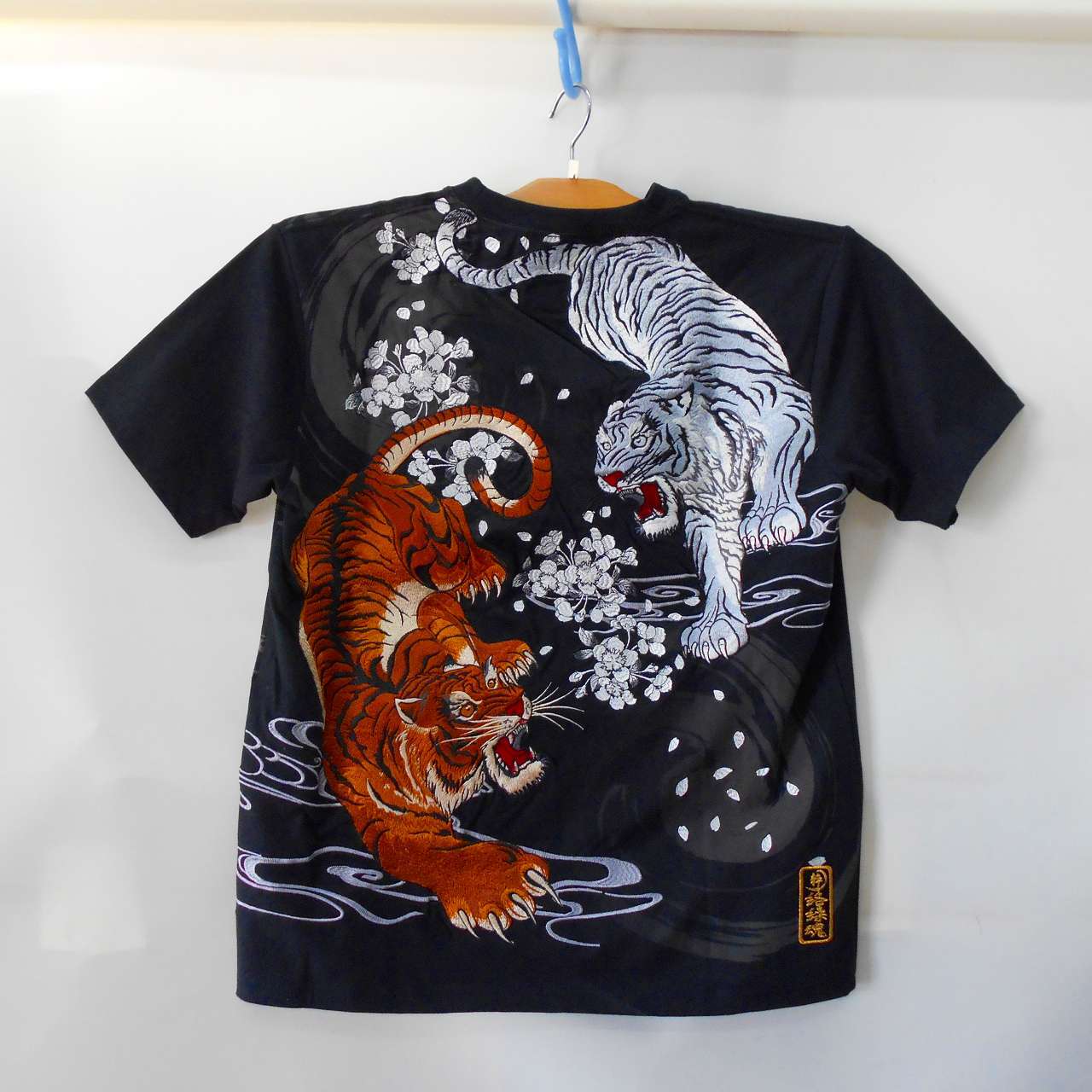 和柄半袖Tシャツ 金トラ 白トラ A T-shirt with embroidery of two tigers.