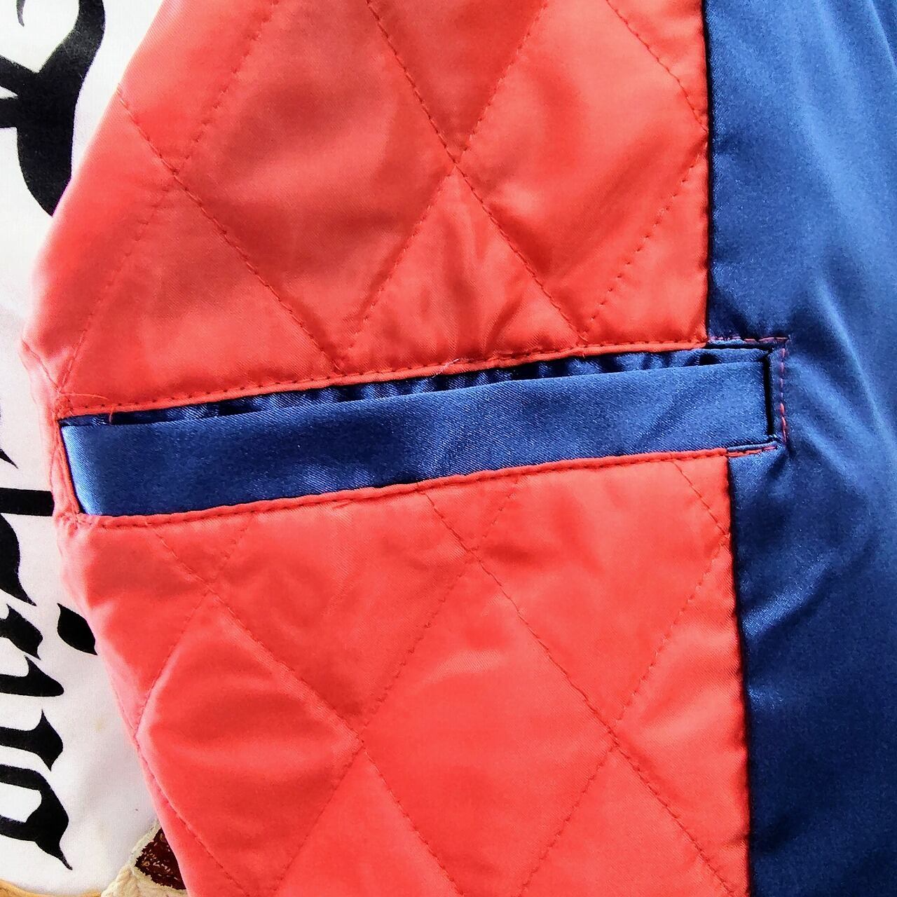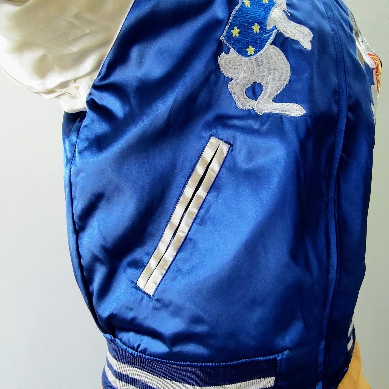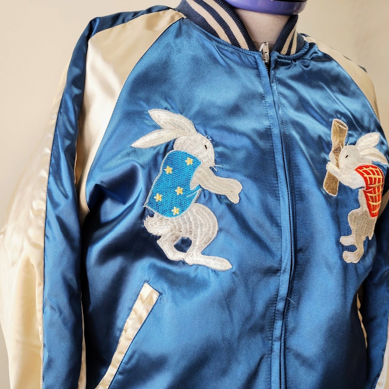 紺のサテン生地に切り替え部分にベージュのサテン生地のスカジャンです。