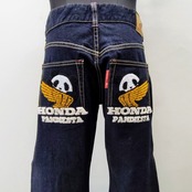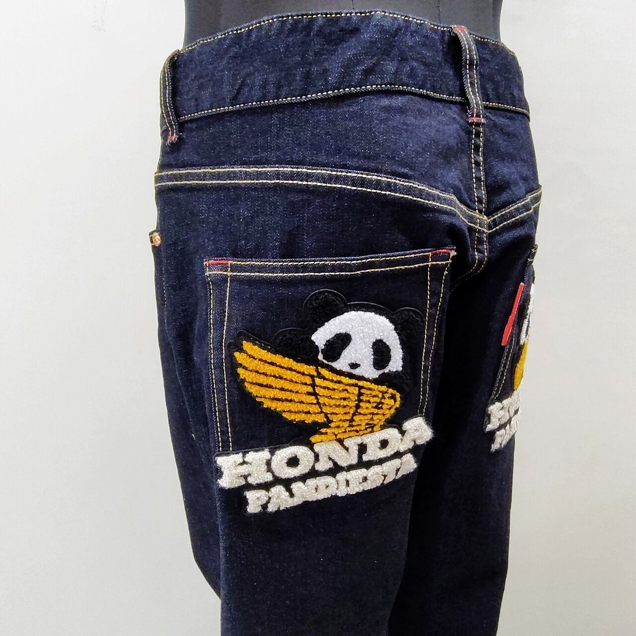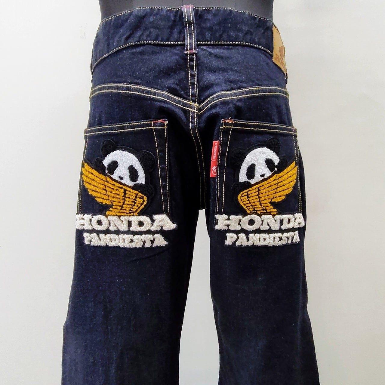 この特別なデニムパンツは、パンディエスタとHONDAのコラボレーションによるもので、お尻のポケットにはホンダウイングとかわいいパンダの刺繍が施されています。