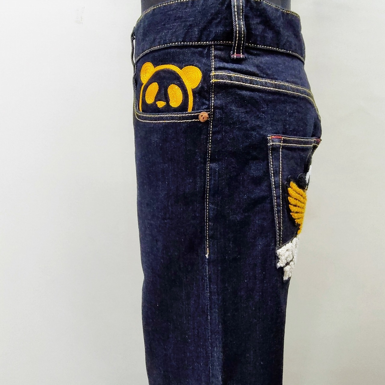 パンディエスタHONDAコラボ 刺繍デニムパンツ 38インチ 紺 Denim pants with panda embroidery.