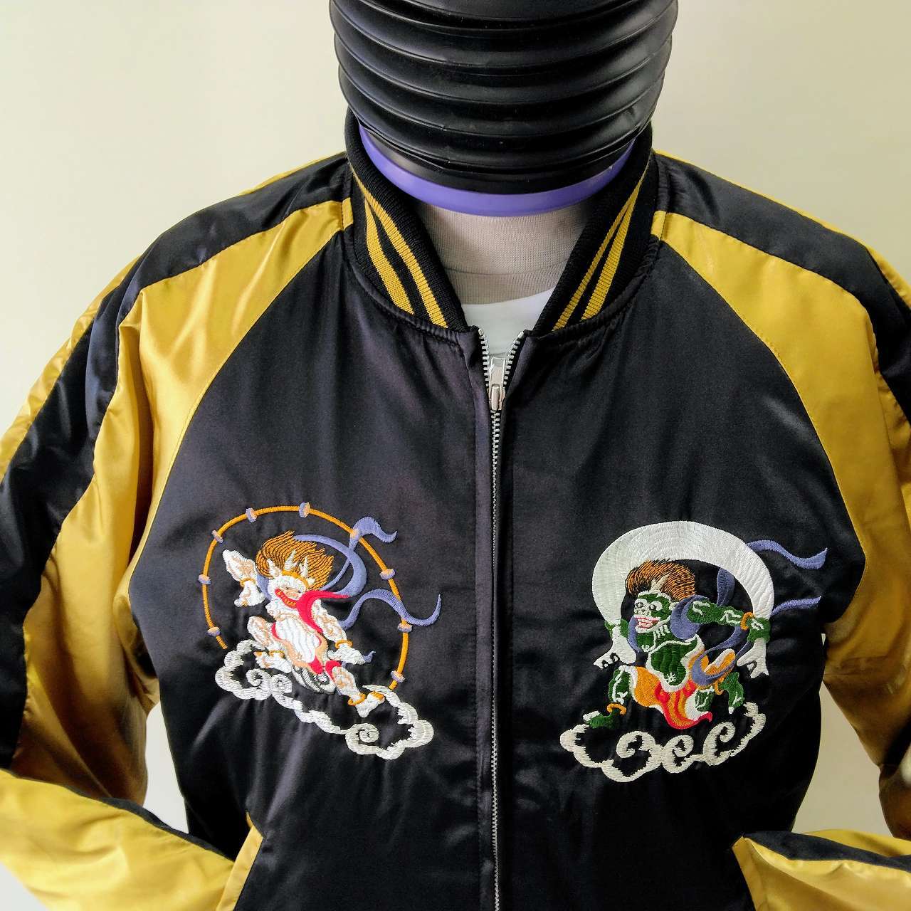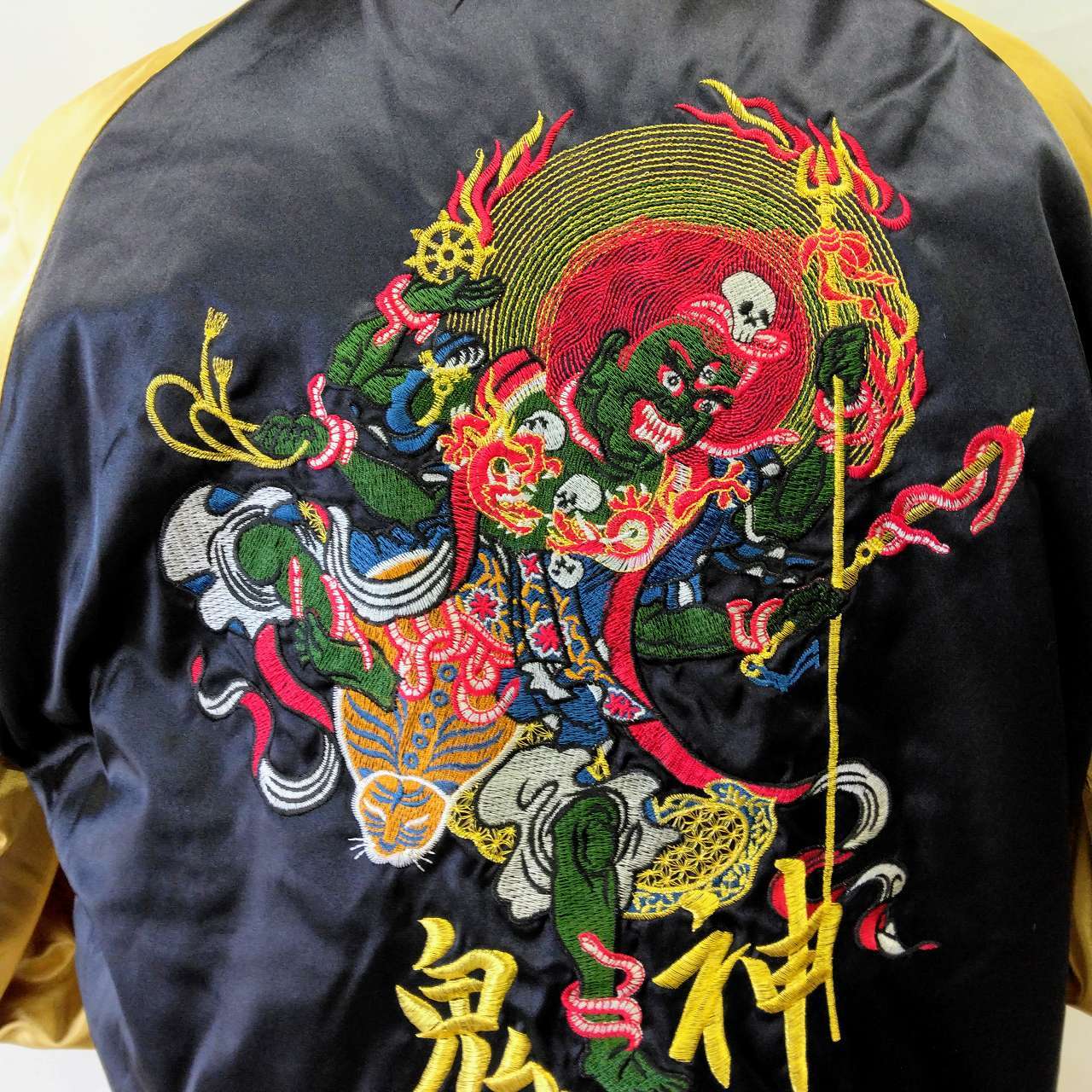 鬼神刺繍のスカジャンです。鮮やかな黒のサテン生地にゴールドの切り替えです。