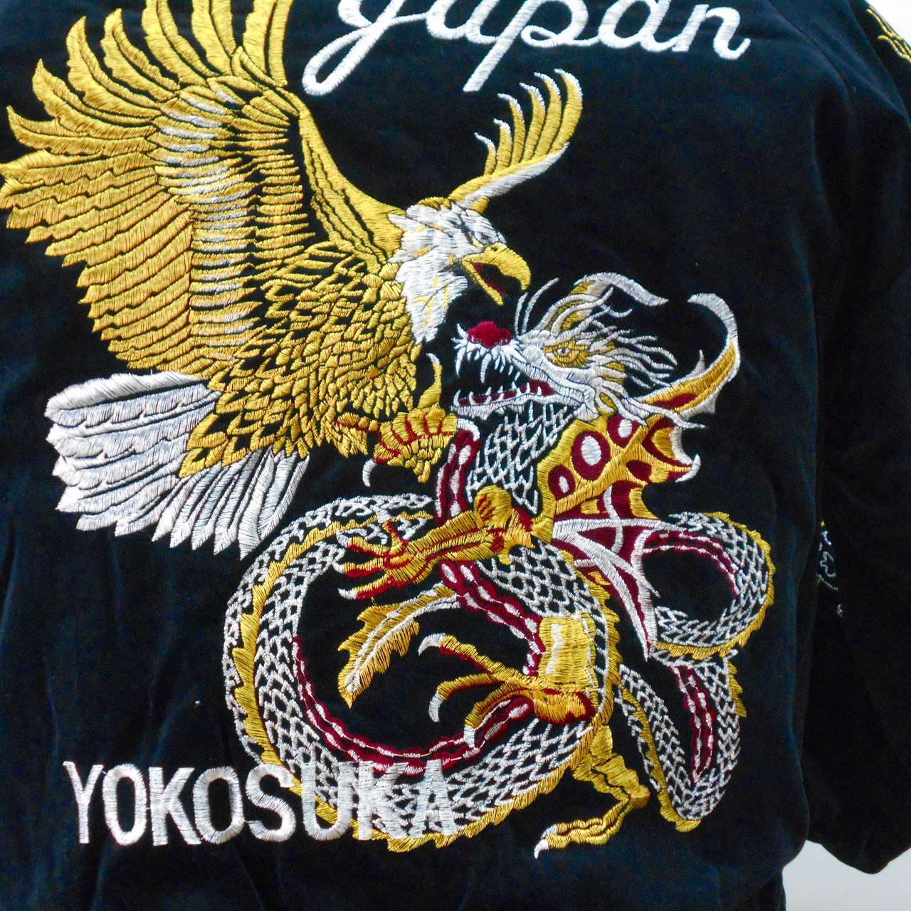 別珍 タカ龍刺繍 スカジャン 黒 L Embroidered jumper (SUKAJYAN)