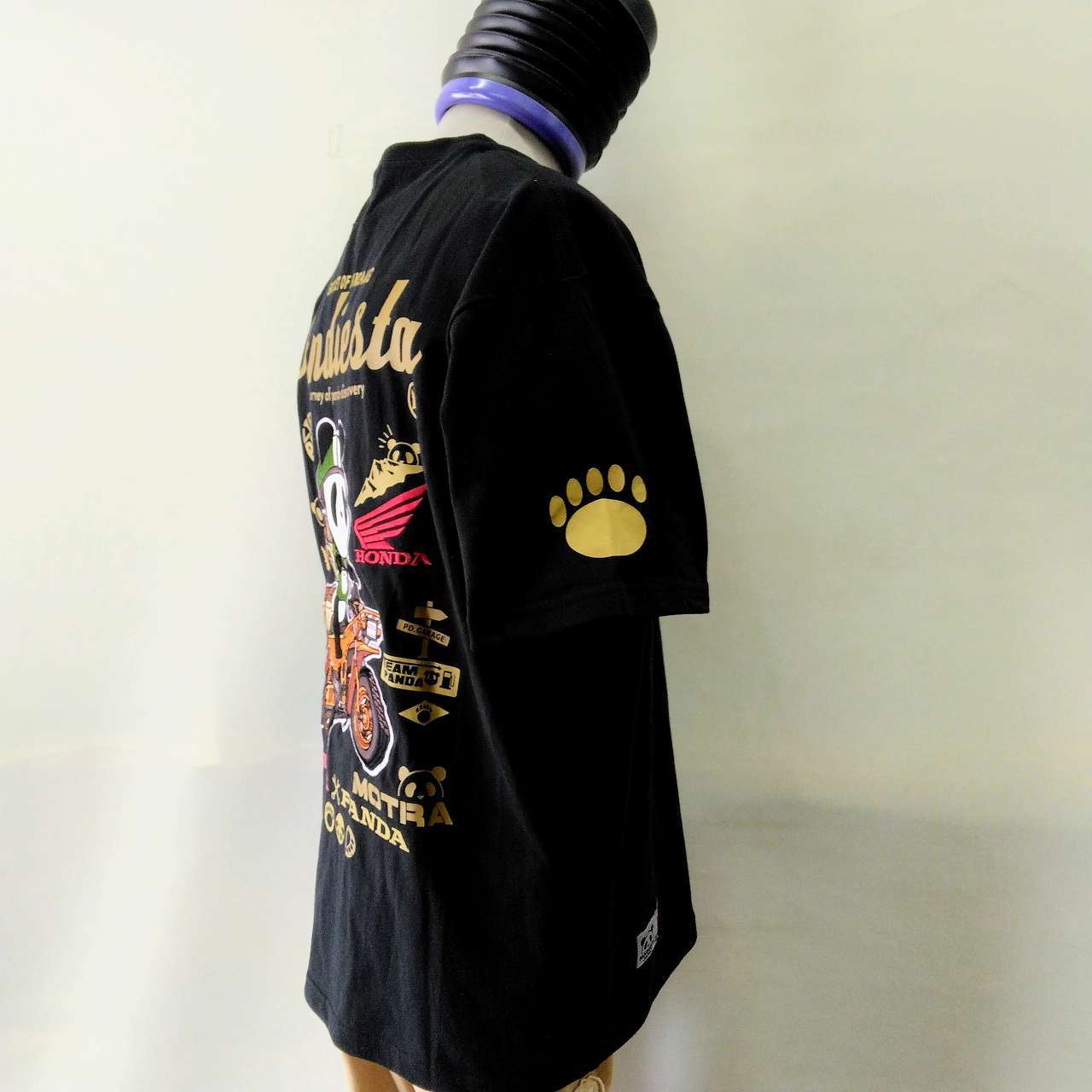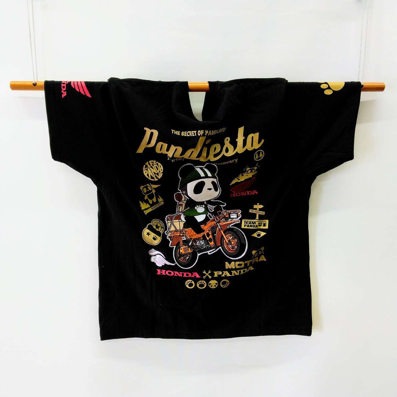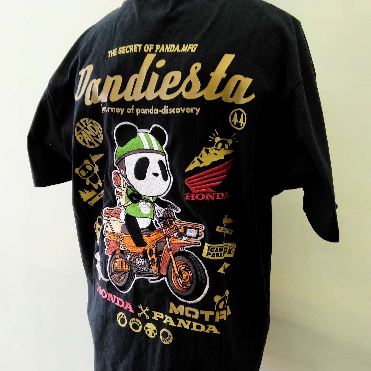パンディエスタ&HONDAコラボ 半袖Tシャツ MOTRA 黒 XL T-shirt with Honda motorcycle and panda embroidered on the back