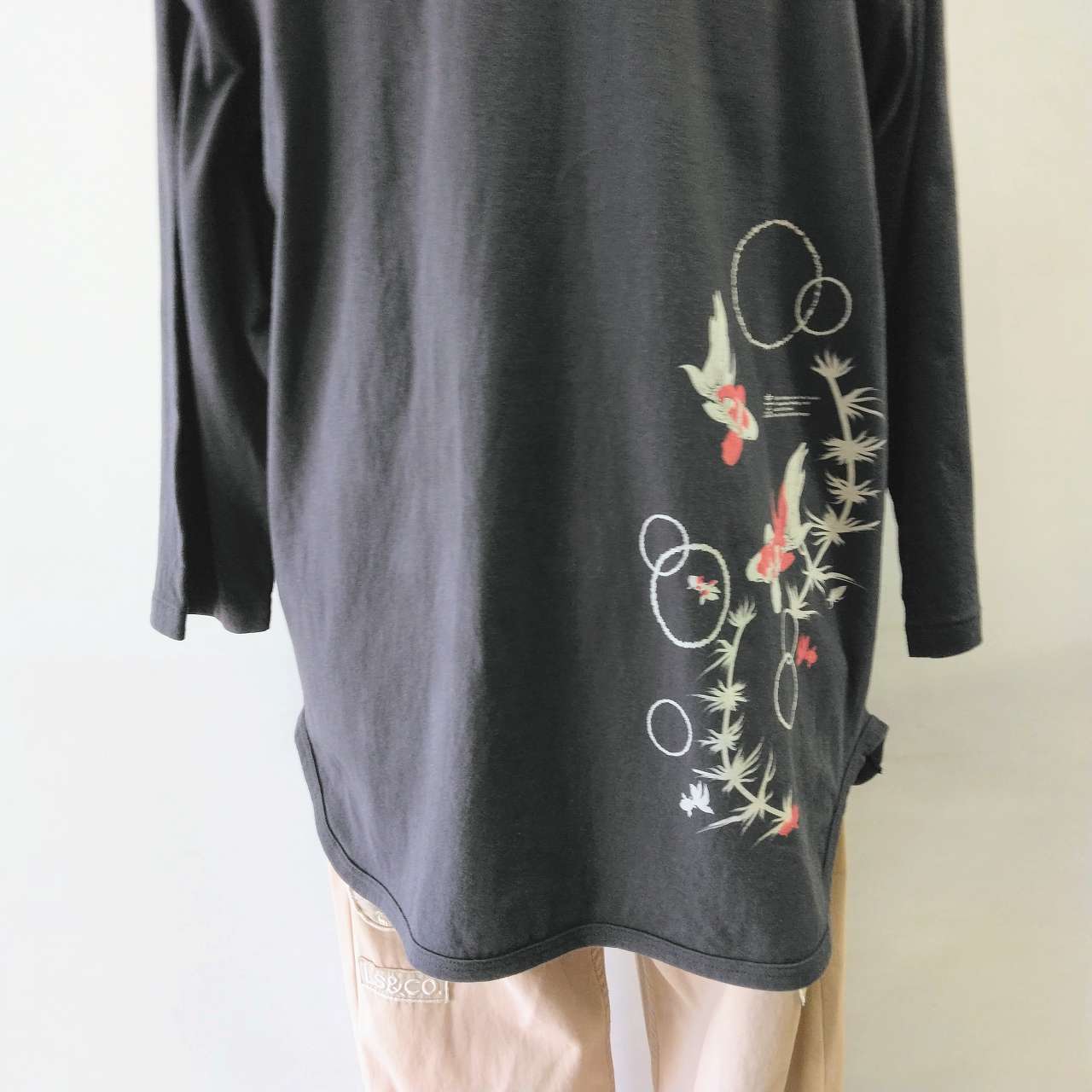 7分袖 和柄Tシャツ 金魚プリント チャコール XXL Goldfish print T-shirt