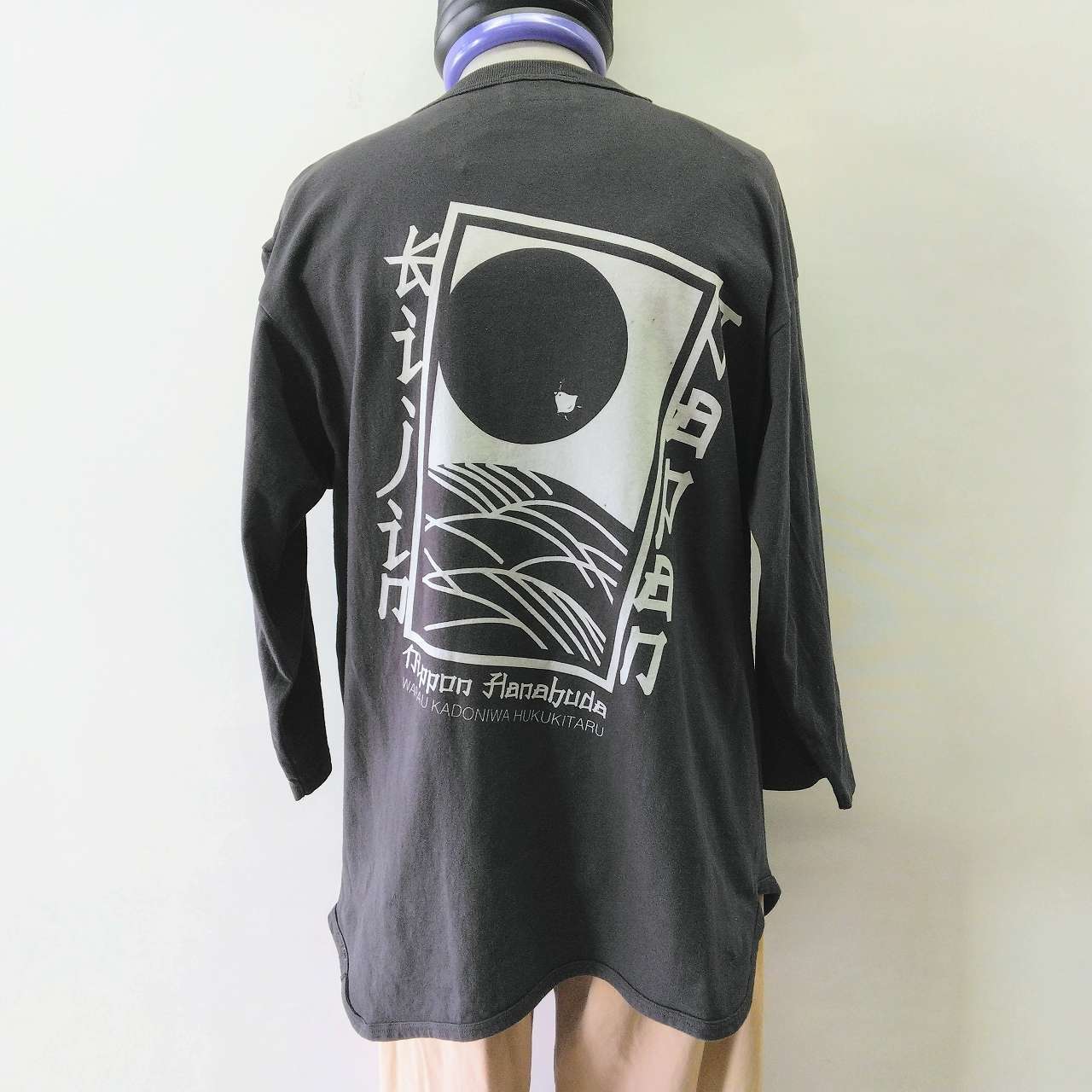 花札プリントの7分袖Tシャツは、背中には大きなお月見札と可愛らしい千鳥が描かれています。