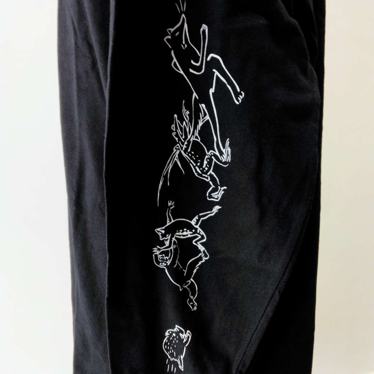 ねずみが盗んだチーズを追う鳥獣戯画の動物たちが描かれており、その独特な雰囲気が着る人を個性的に演出してくれます。