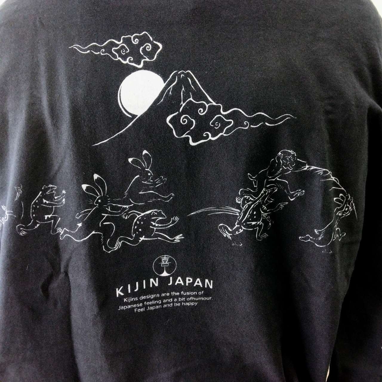 和柄プリントが目を引く「鬼ごっこプリント」の黒Tシャツ。