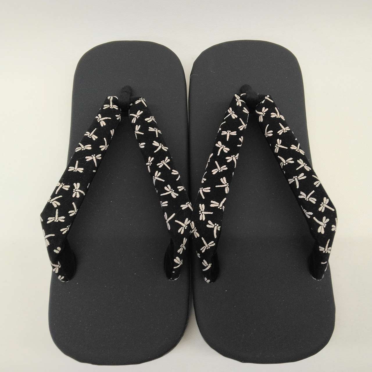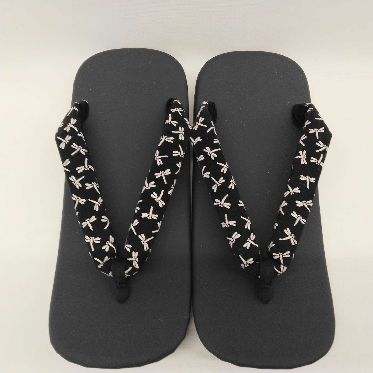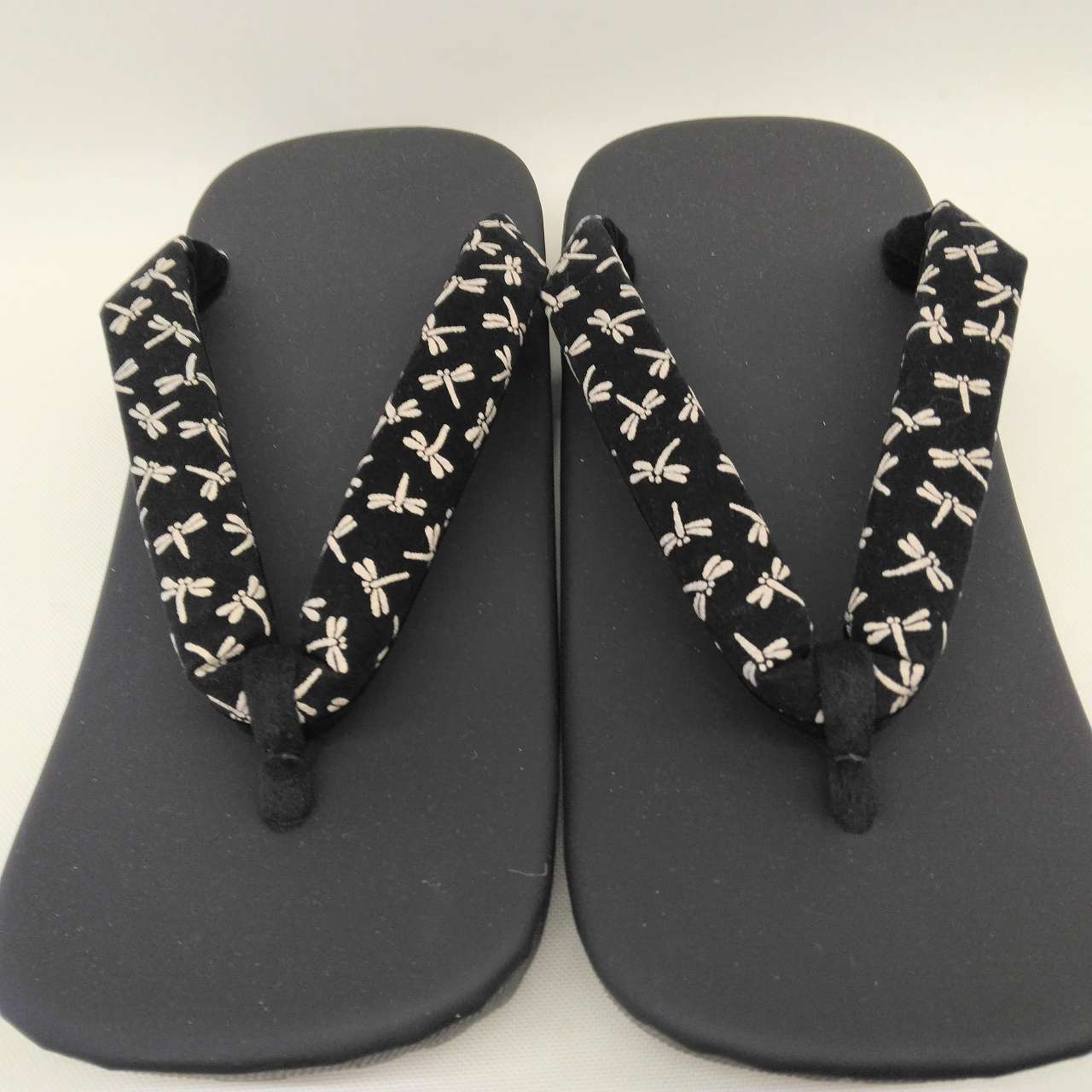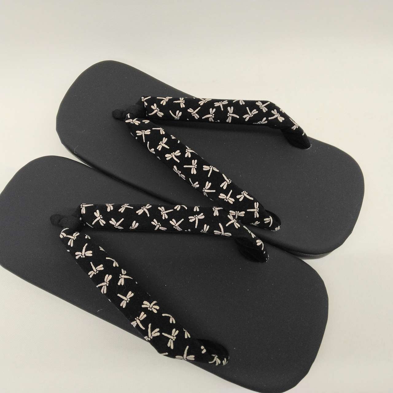 この雪駄は、シンプルでありながらスタイリッシュな黒のマット素材に、遊び心満載のトンボ柄鼻緒をあしらった一品です。