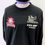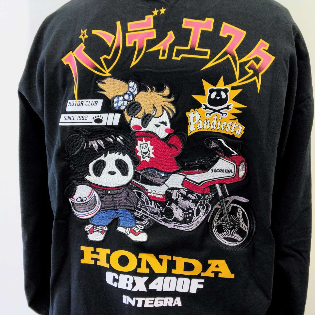 HONDAとパンディエスタのコラボレーションによる魅力的なロンTで、背中には愛らしいパンダの男の子と女の子がCBX400Fに乗る様子が刺繍されています。