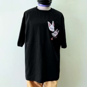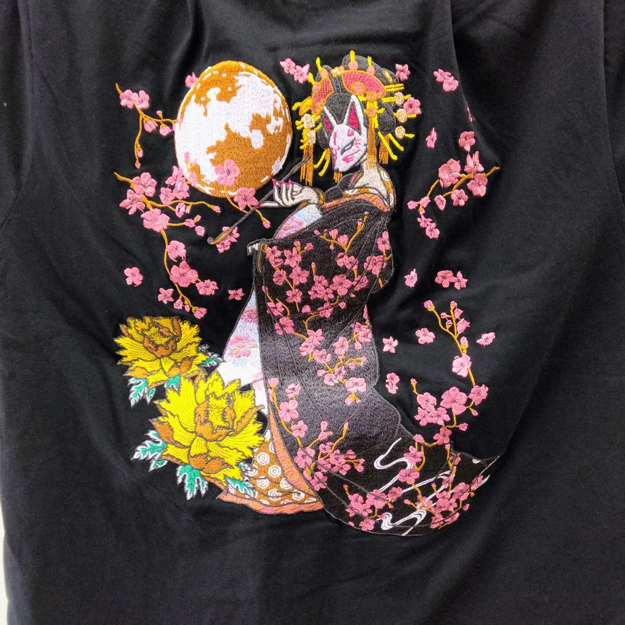 和柄刺繍半袖Tシャツ きつねのお面をつけた花魁風刺繍 Lサイズ